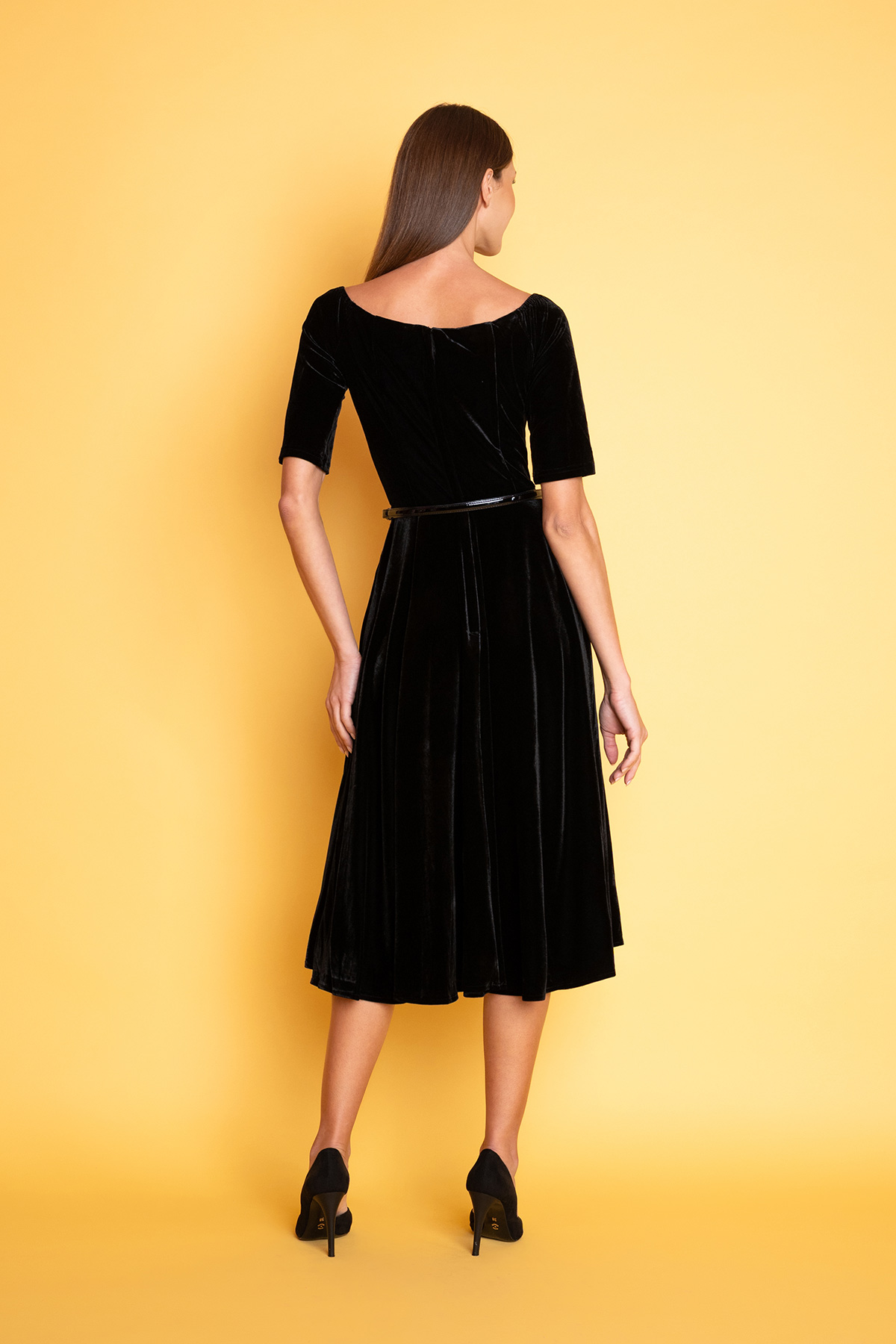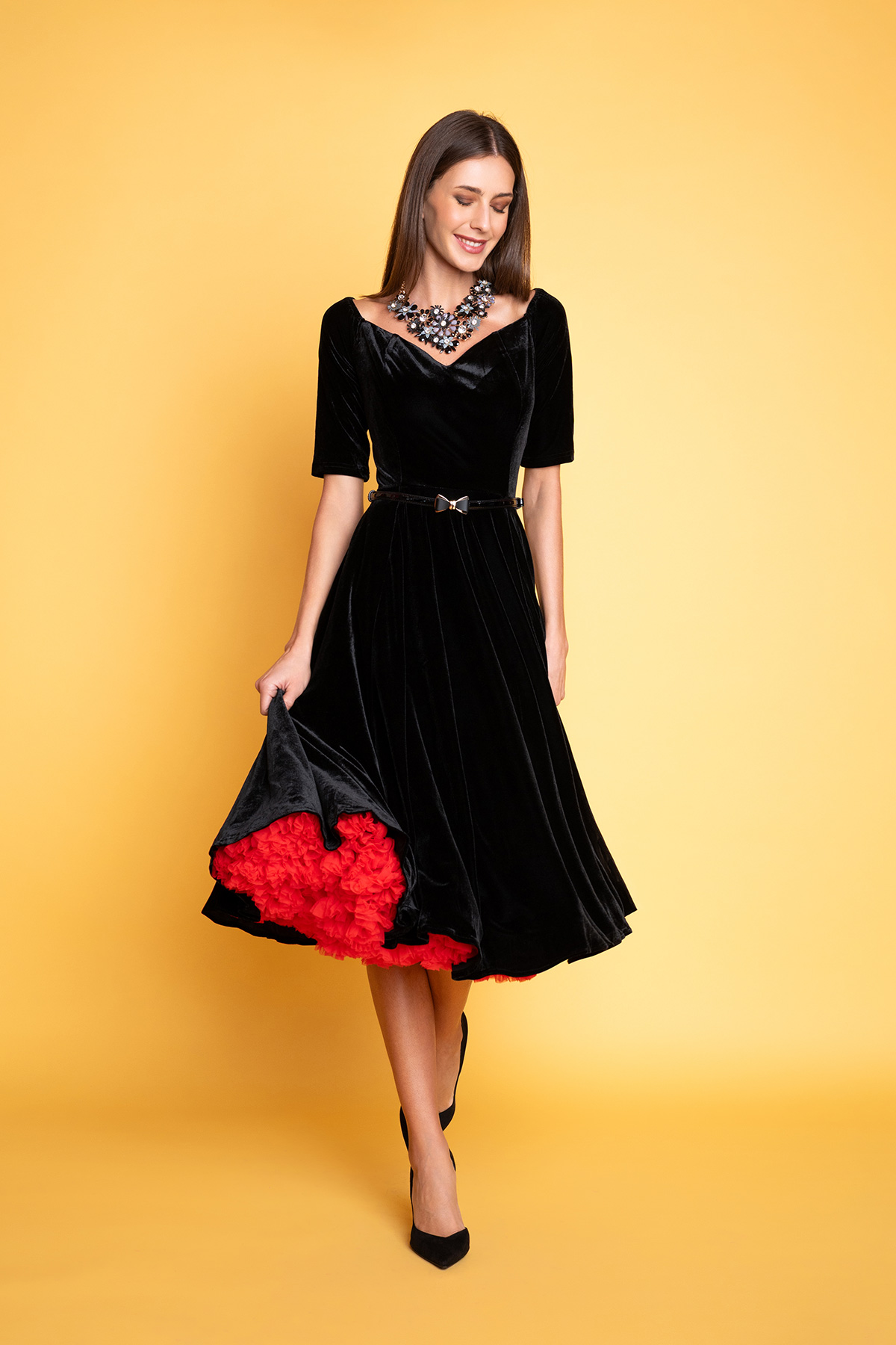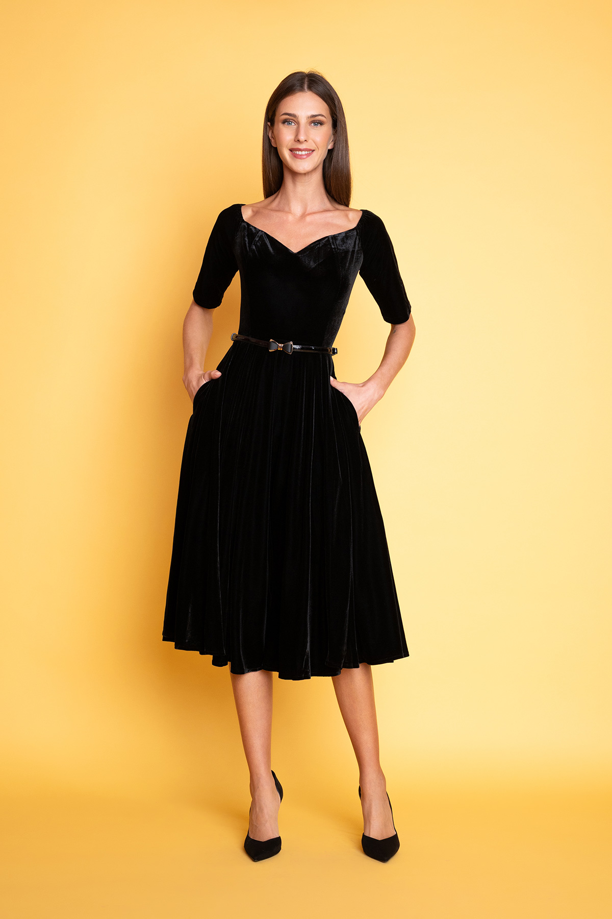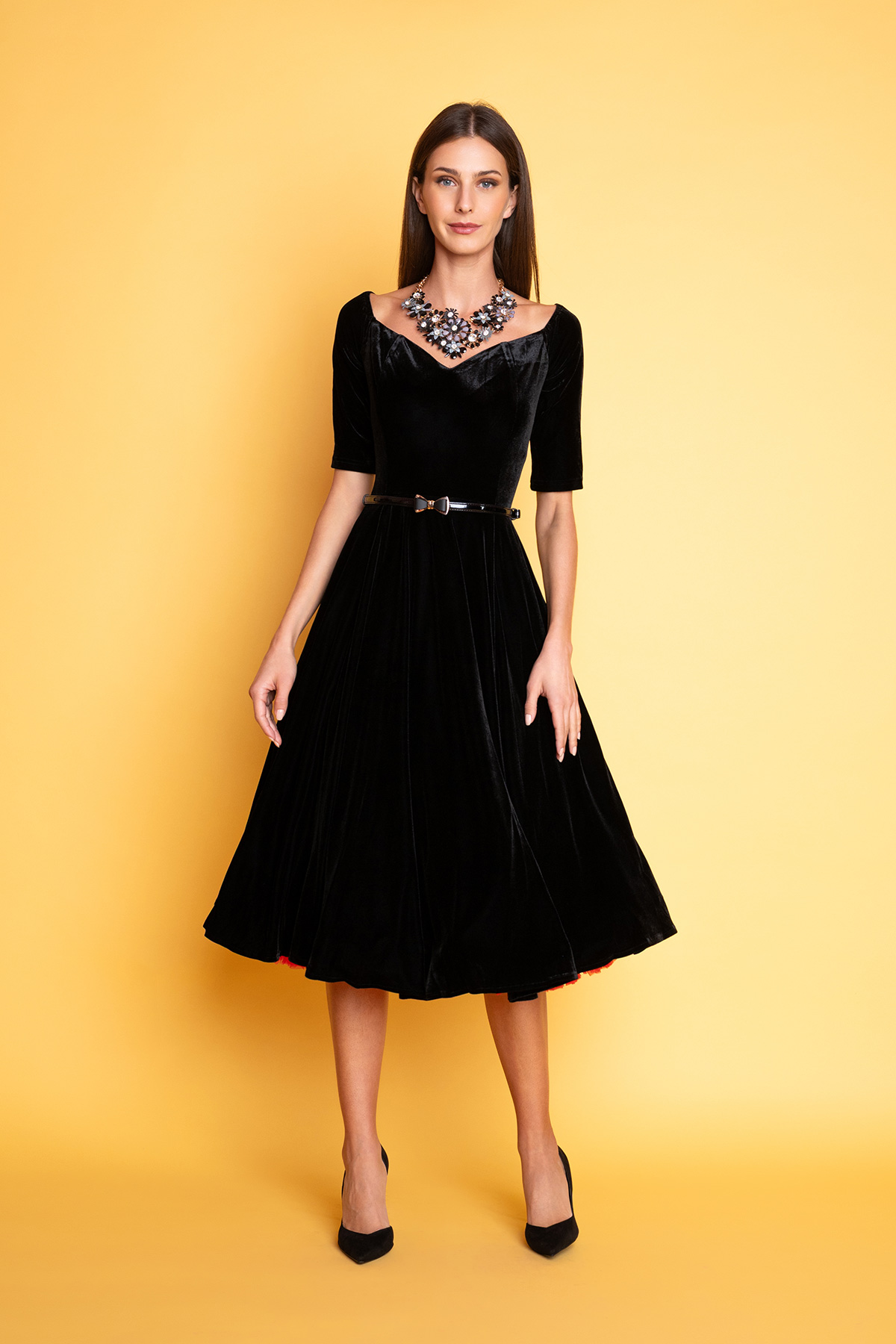 Μαύρο μεσάτο φόρεμα, με ανοιχτούς ώμους και κοντά μανίκια, από μαλακό και ελαστικό ύφασμα βελούδο, εφαρμοστό στον κορμό, με κομψή λαιμουδιά που σχηματίζει ανοιχτή καρδιά στο μπούστο, full swing φούστα με τσέπες μέχρι το γόνατο, και φερμουάρ στην πλάτη. Υπέροχο φόρεμα που αναδεικνύει τη γυναικεία σιλουέτα, για ειδικές περιστάσεις! Συνδυάστε το με ένα φουρό για το απόλυτο retro look!
