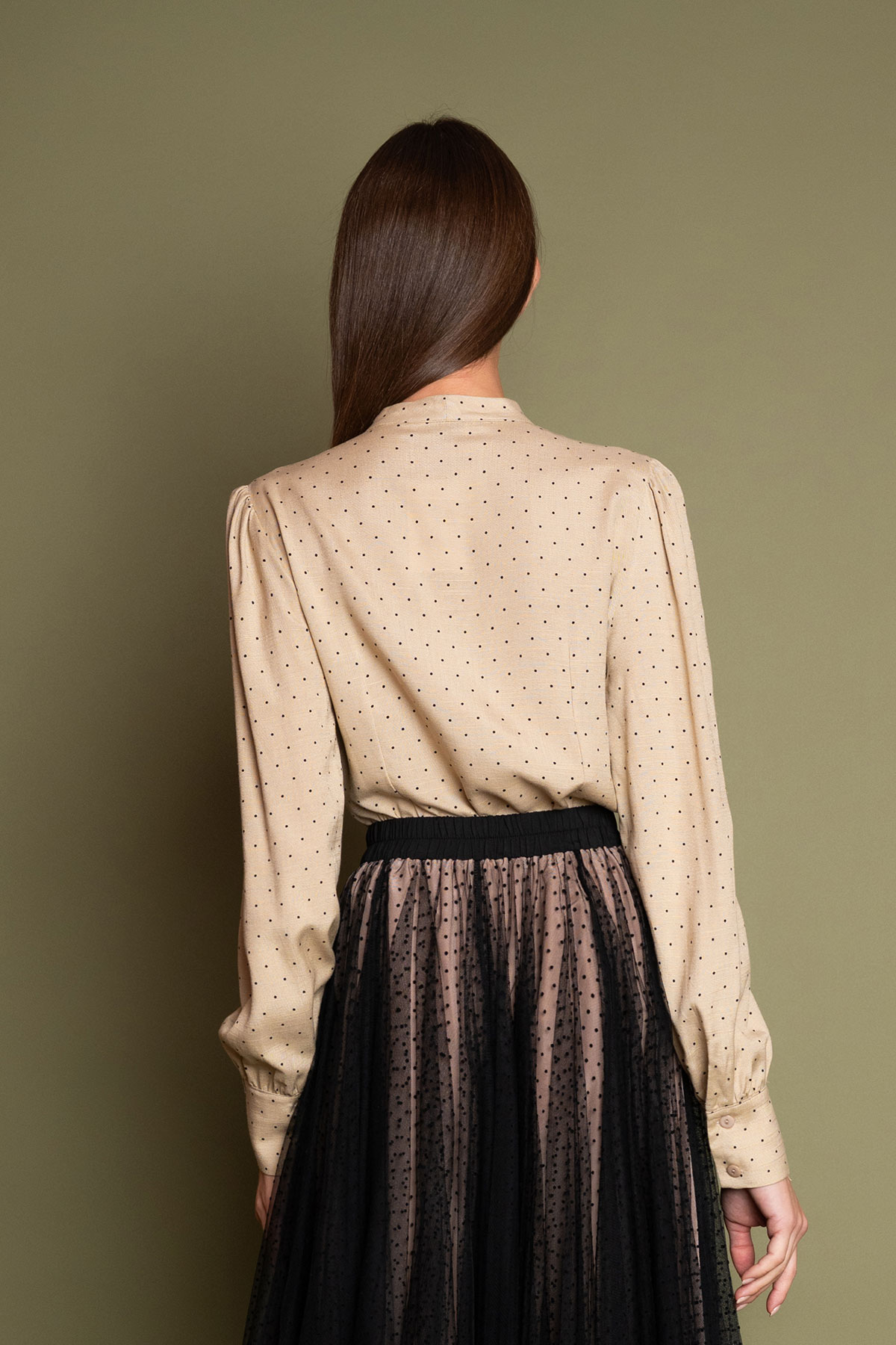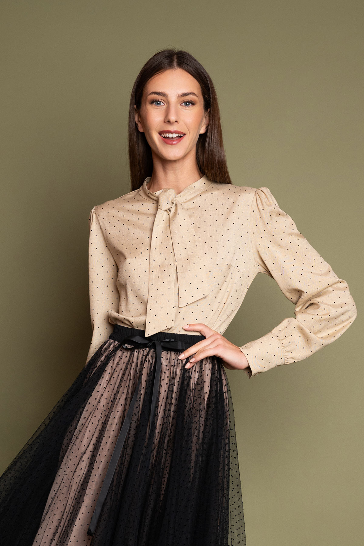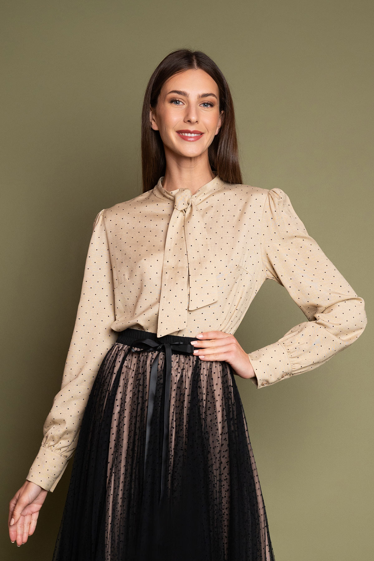 Υπέροχο πουκάμισο σε vintage στιλ, από απαλό και άερινο ύφασμα βισκόζης και μικρά μαύρα πουά. Κλείνει με κουμπιά, και δένει μπροστά με φιόγκο καλύπτοντας όλα τα κουμπιά. Τα ελαφρώς φουντωτά μακριά μανίκια καταλήγουν σε φαρδιά μανσέτα που κλείνει με κουμπάκια. Το ρετρό ύφος και η χαλαρή εφαρμογή το κάνουν ιδανικό για όλες τις ώρες. Συνδυάστε το με μια φούστα σε ίσια γραμμή ή μια παντελόνα για το απόλυτο office look.