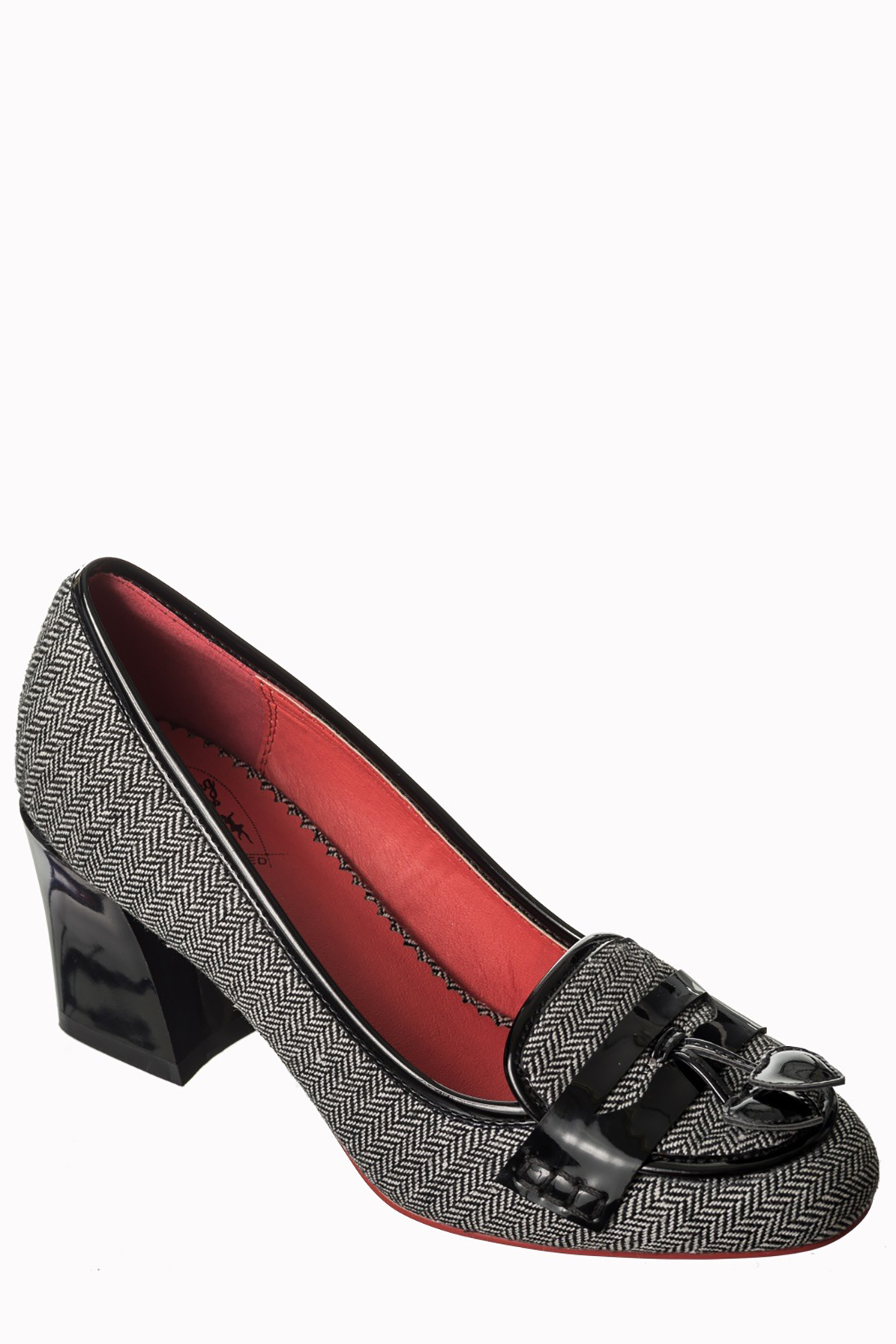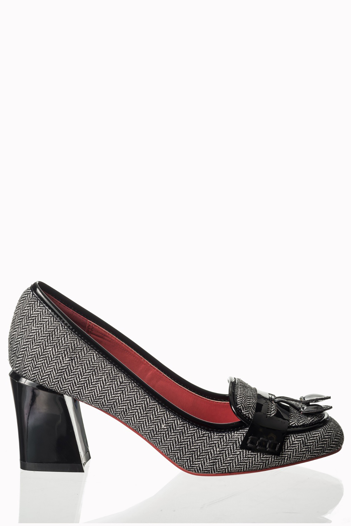 Μαύρα tweed γοβάκια με λουστρίνι λεπτομέρεια μπροστά, charm με καρδούλες στο επάνω μέρος, στρογγυλή μύτη και τετράγωνο τακούνι. Φορέστε τα από το πρωί στη δουλειά με μια στενή φούστα ή παντελόνα, και το βράδυ με το αγαπημένο σας ρετρό φόρεμα για ένα vintage inspired look. Υπέροχες γόβες για ξεχωριστές εμφανίσεις!