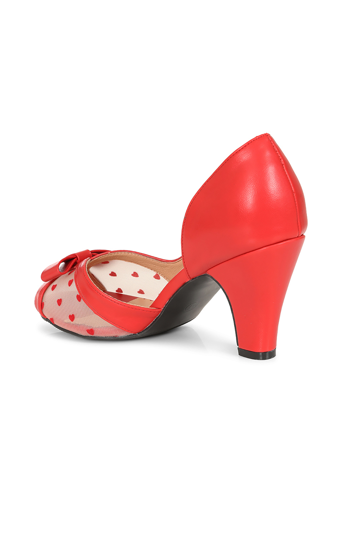 Τα κόκκινα γοβάκια είναι ένα αληθινό “ερωτικό γράμμα” στη vintage αισθητική και το flirty στυλ. Κατασκευασμένα από κλασικό κόκκινο συνθετικό δέρμα, διαθέτουν το απόλυτα θηλυκό άνοιγμα peep toe σε σχήμα καρδιάς και μια αιθέρια λεπτομέρεια από mesh (διχτυωτό ύφασμα), στολισμένη με μικροσκοπικές κόκκινες καρδιές.