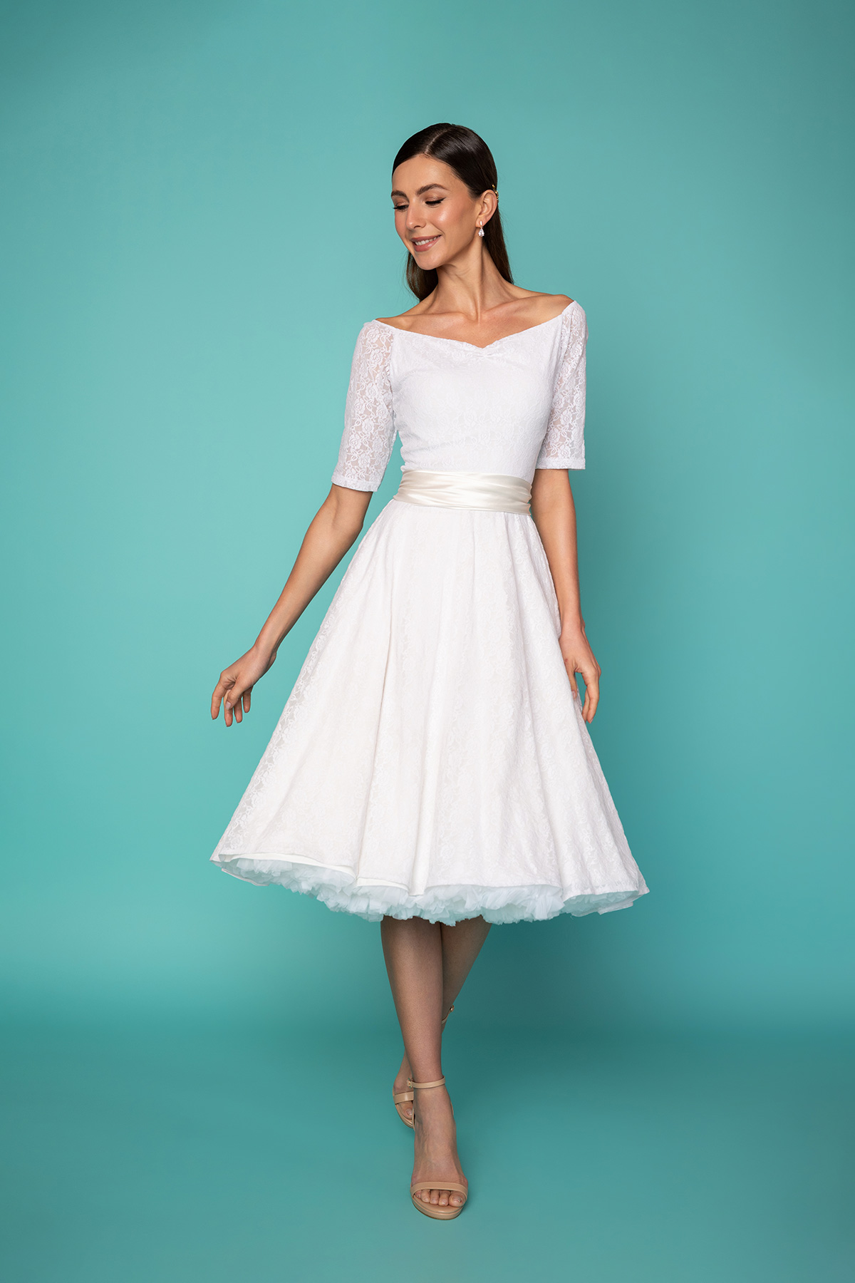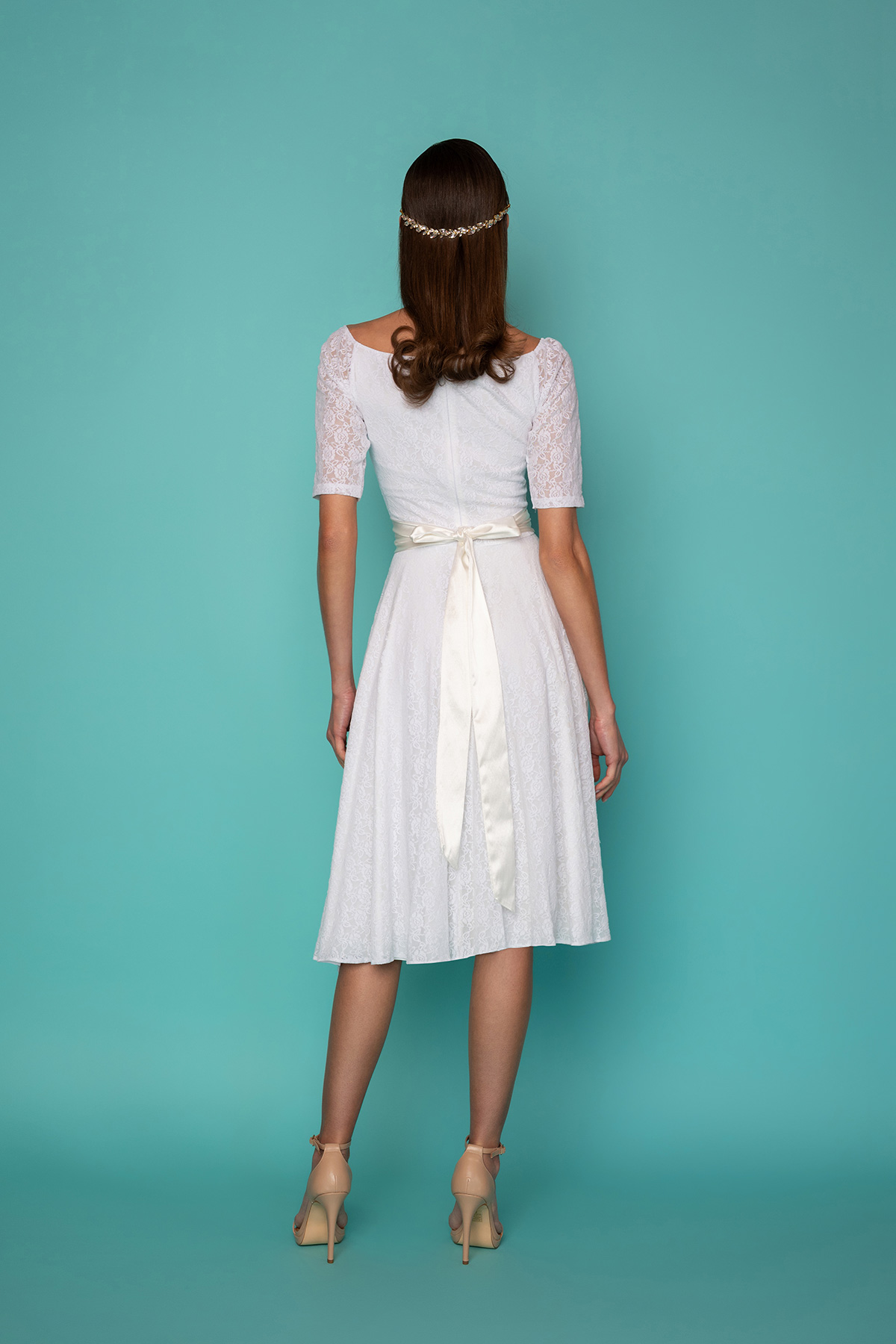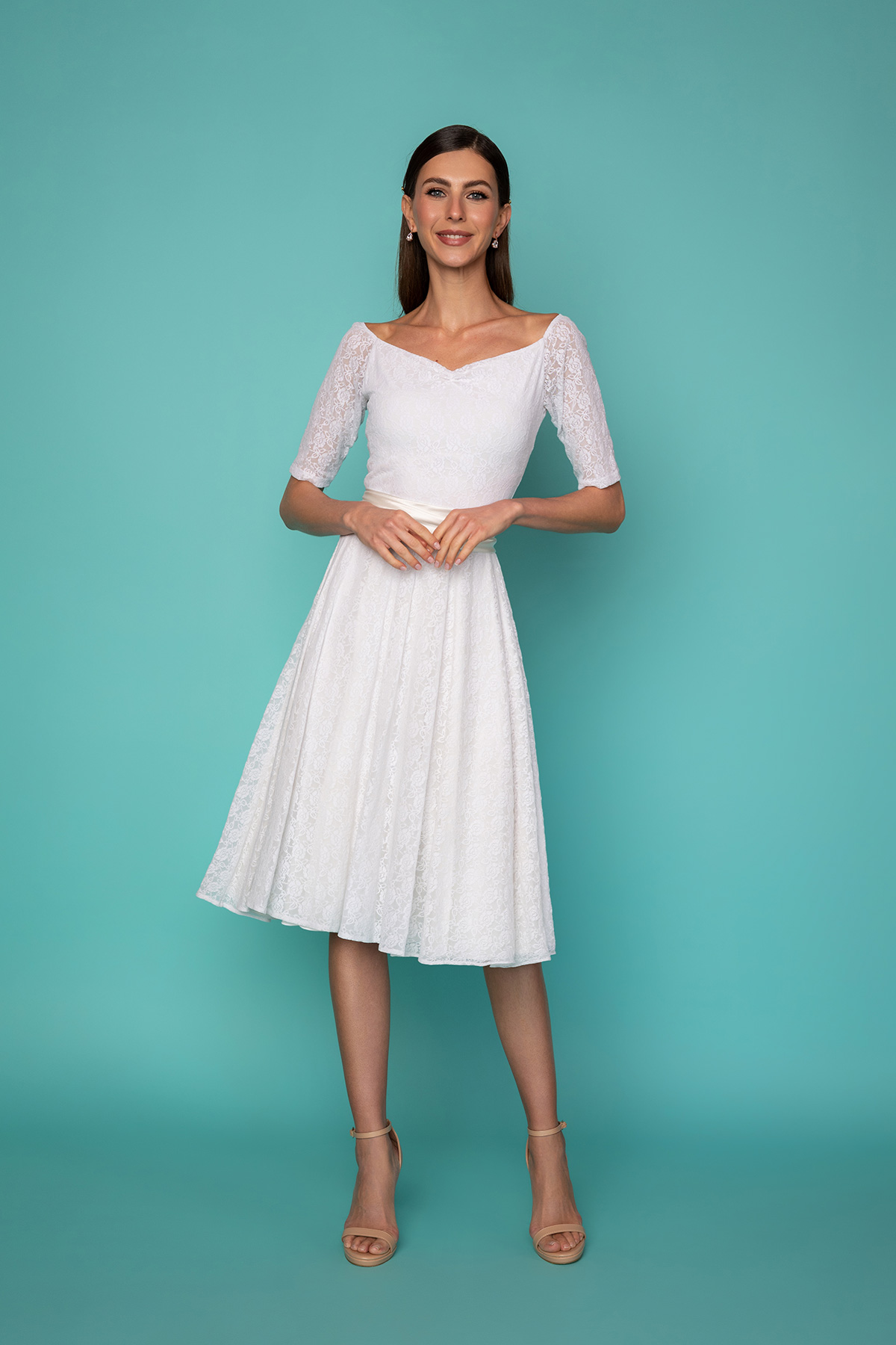 Δαντελένιο midi φόρεμα σε μεσάτη γραμμή, από υπέροχη λευκή δαντέλα και μήκος μέχρι το γόνατο. Κοντομάνικο, με διαφάνεια στους ώμους και τα χέρια και ελαστική λαιμουδιά που σχηματίζει ανοιχτή καρδιά και αφήνει τα μανίκια να πέσουν στους ώμους, είναι το πιο chic φόρεμα για να συνοδεύσει μια επίσημη εμφάνισή σας. Έχει ντραπαριστή υφασμάτινη κορδέλα για ζώνη στη μέση, που δένει πίσω με φιόγκο σε λευκό χρώμα. Ιδανικό φόρεμα για μια ιδιαίτερη περίσταση ή το γάμο σας. Συνδυάστε το με ένα φουρό για πιο εντυπωσιακό αποτέλεσμα, όπως στη φωτογραφία.