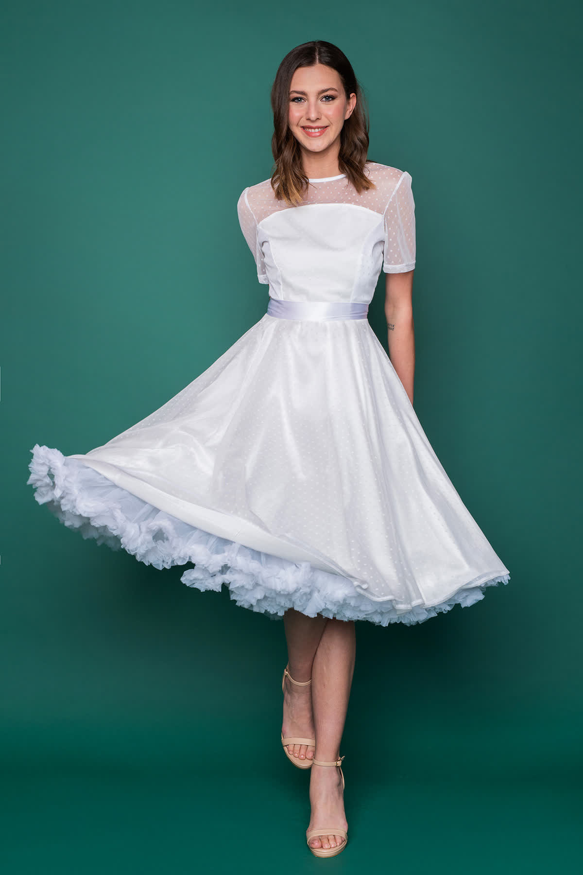 Λευκό κλος vintage φόρεμα σε μεσάτη γραμμή, ιδανικό να φορεθεί ως νυφικό φόρεμα ή σε μια επίσημη περίσταση. Η λαιμουδιά, με τη διαφάνεια, σε οβάλ σχήμα , το εσωτερικό σατέν ύφασμα και το υπέροχο σχέδιο με τα μικρά πουά στο τούλι, δημιουργούν ένα πολύ εντυπωσιακό φόρεμα. Με κοντά μανίκια και εφαρμοστό στον κορμό μέχρι τη μέση, κλείνει στο πίσω μέρος με κρυφό φερμουάρ και μικρό κουμπάκι ψηλά. Η φούστα του ανοίγει σε γραμμή κλος και συνδυασμένο με ένα φουρό δίνει τον όγκο που χρειάζεται ένα vintage style φόρεμα. Συνδυάστε το με φλατ ασορτί παπούτσια για μια πιο αιθέρια εμφάνιση την ημέρα του γάμου σας. Εναλλακτικά, φορέστε το με γόβες και μια κουάφ στα μαλλιά για ένα πιο επίσημο vintage look.