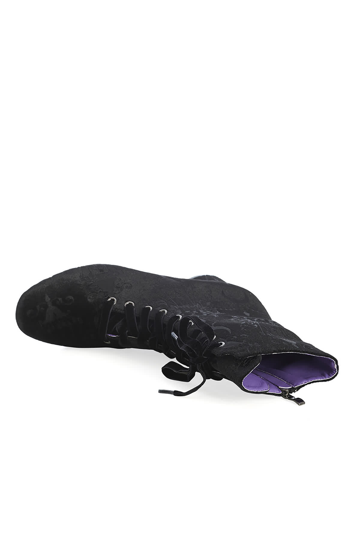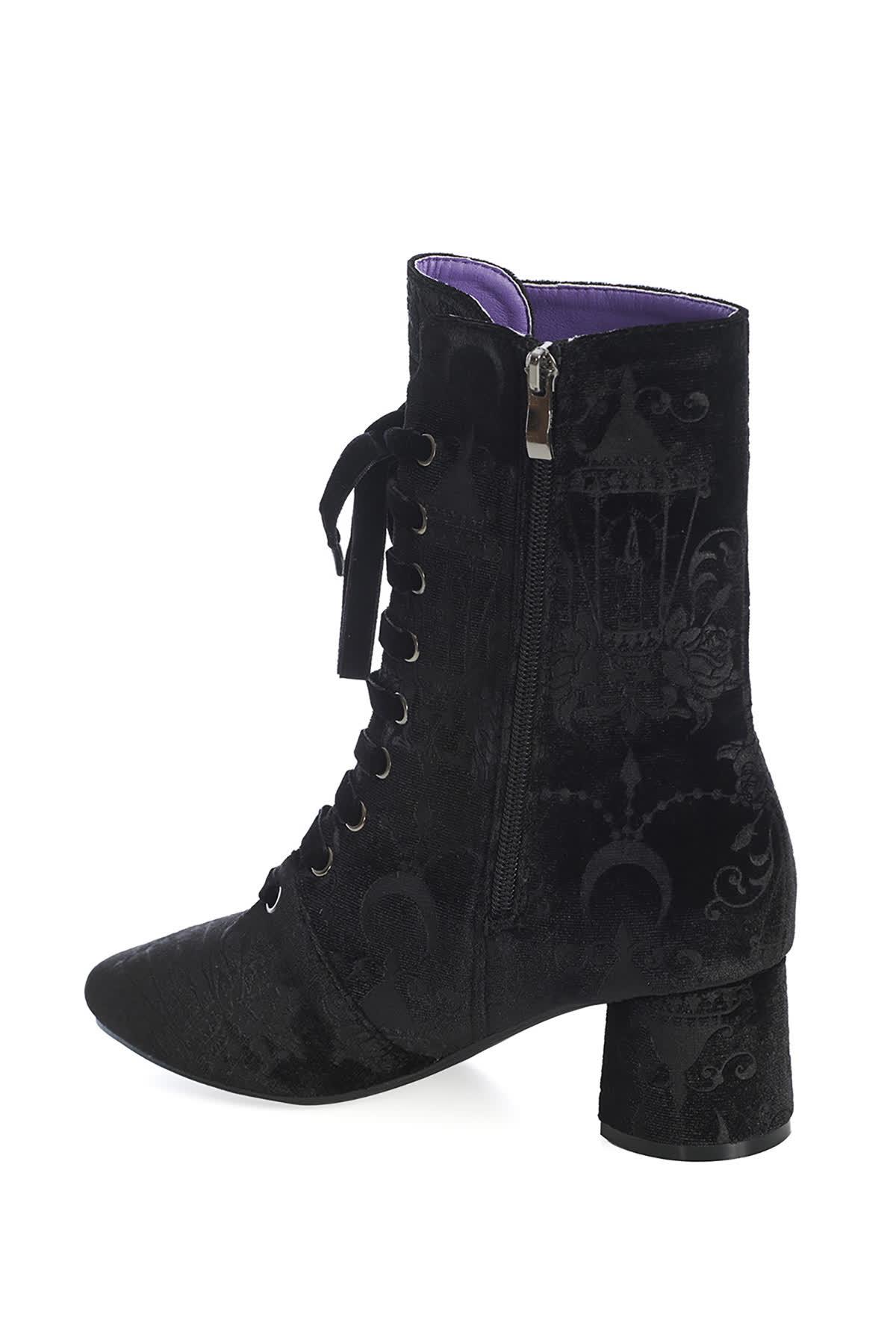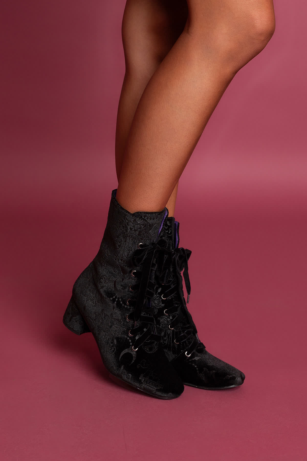 Vintage μποτάκια από μαύρο σατινέ ύφασμα flock, με βεελούδινα κορδόνια και σταθερό τακούνι για άνετη εφαρμογή θα γίνουν τα αγαπημένα σας μποτάκια για να φορεθούν σε πολλές περιστάσεις για ένα ιδιαίτερο look.