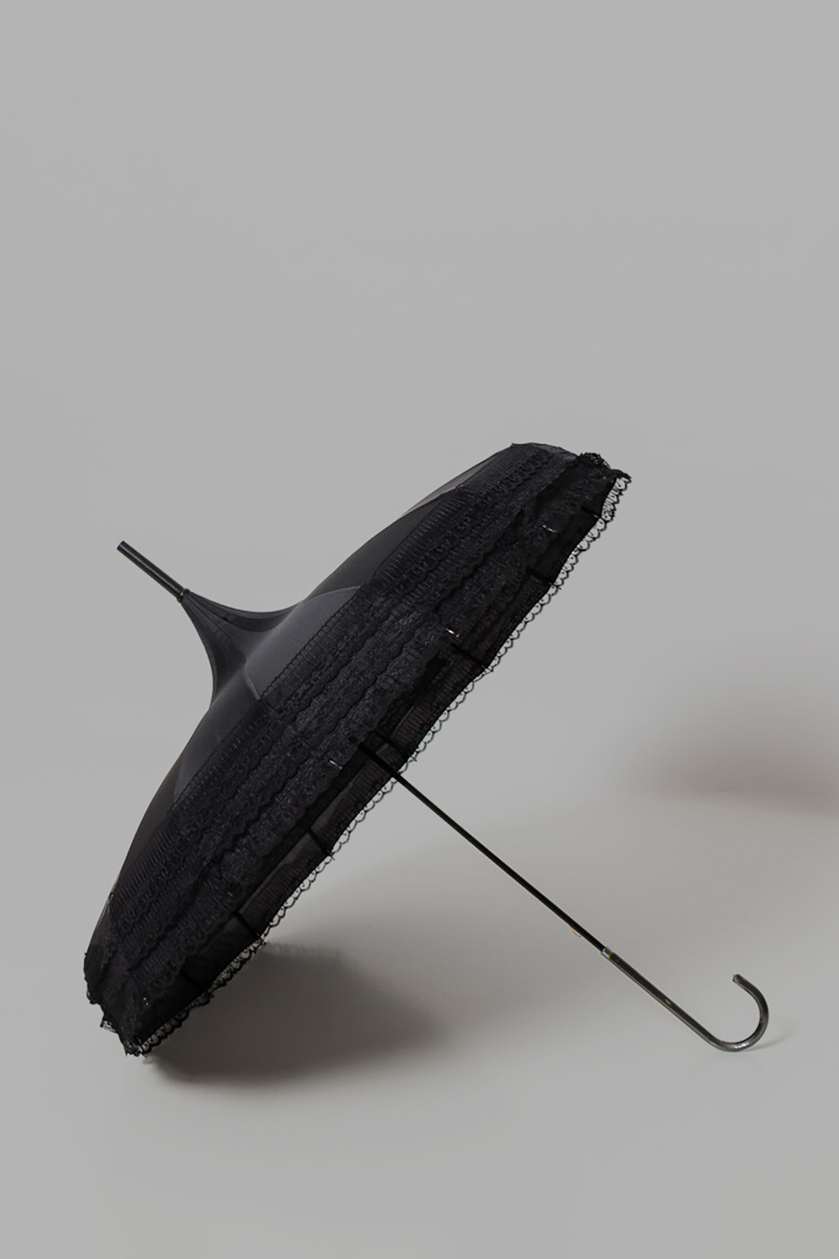 Κομψή μαύρη ομπρέλα σε σχήμα παγόδα, με δαντελένιο τελείωμα σε μαύρο χρώμα.