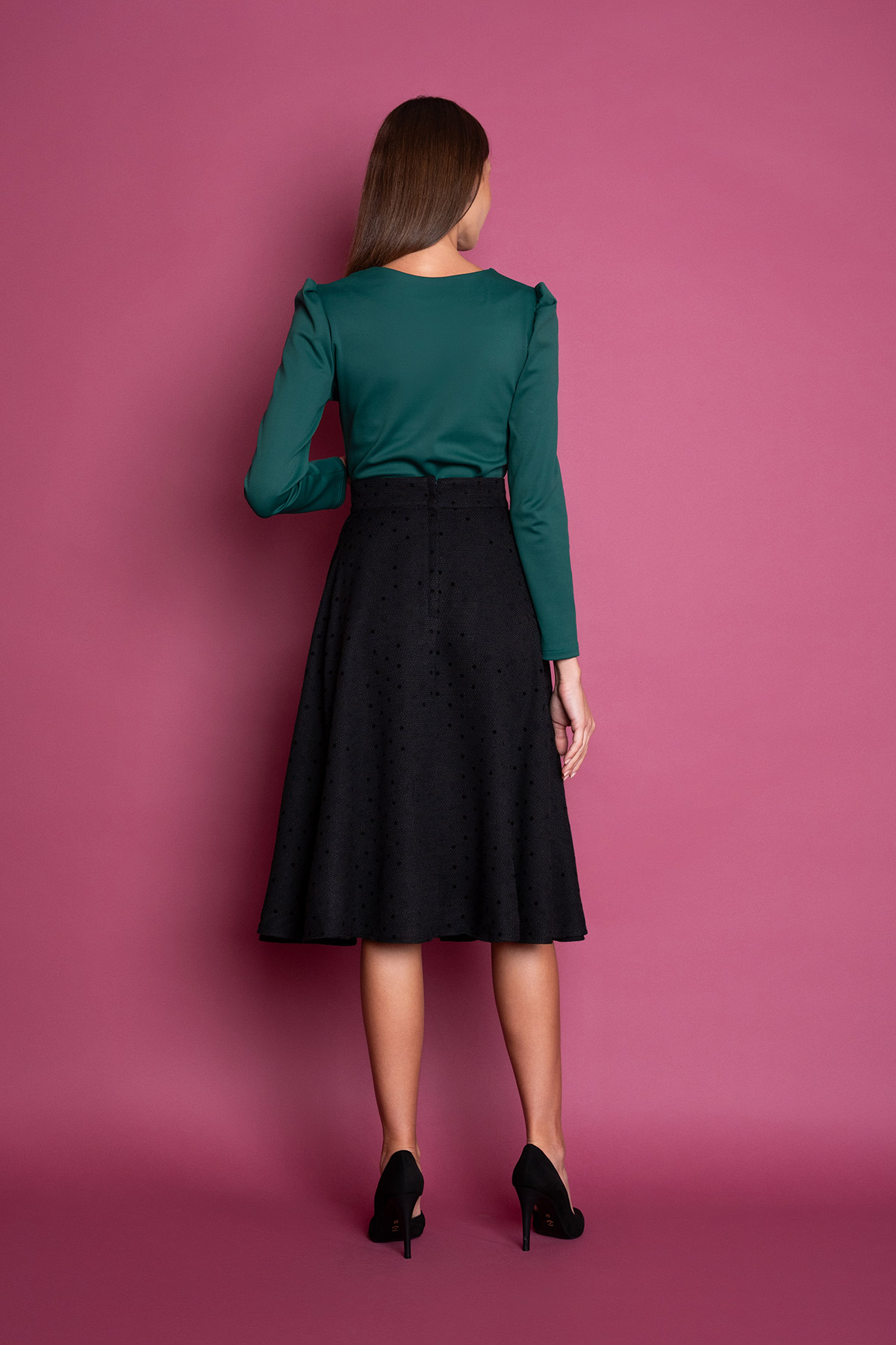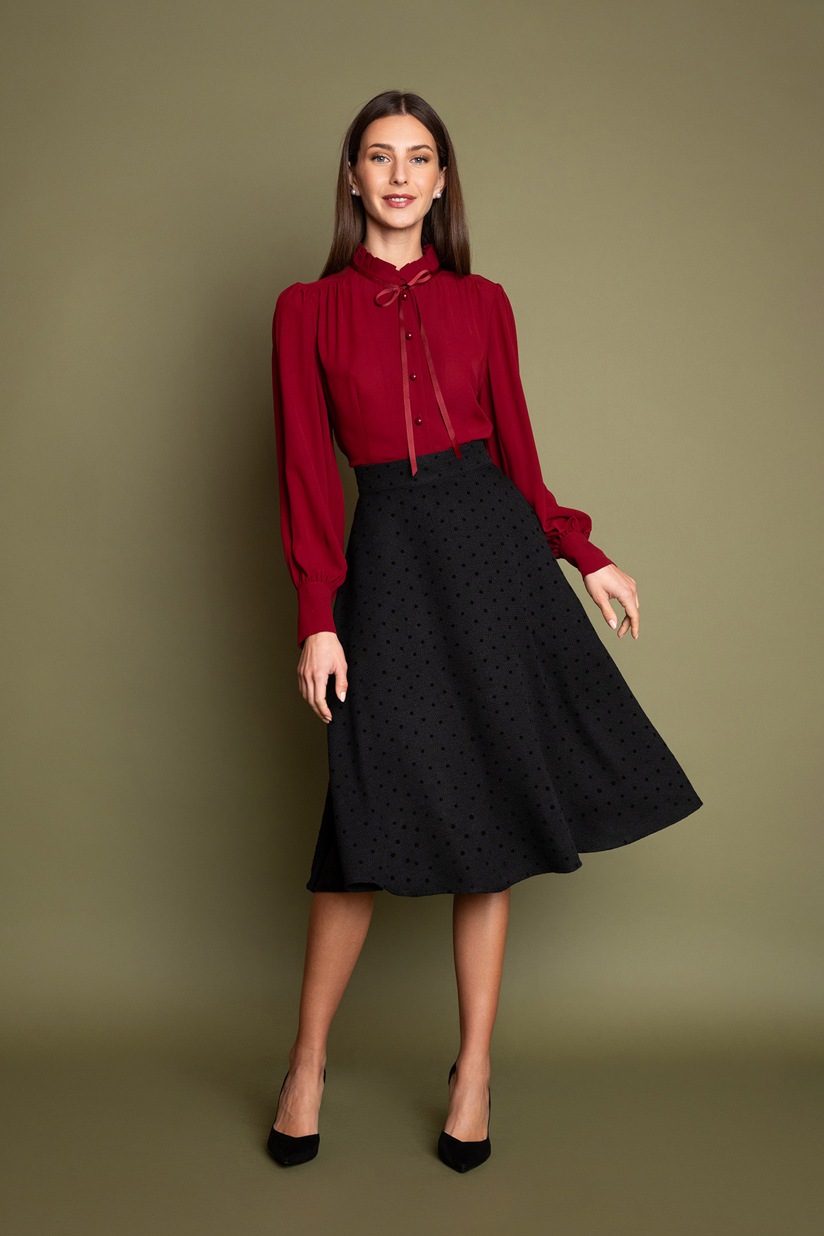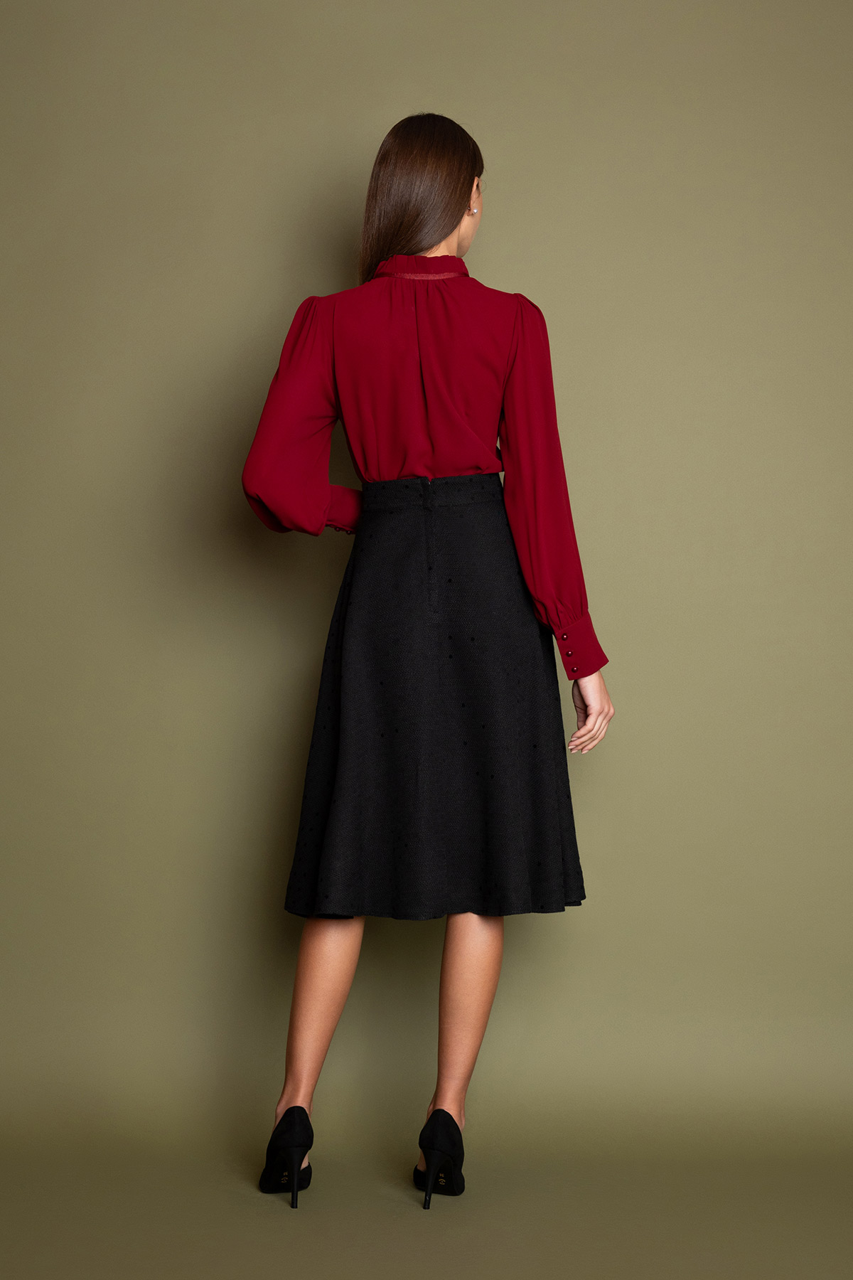 Ψηλόμεση κλος φούστα με μαύρα πουά πάνω σε μαύρο ύφασμα, με τσέπες. Υπέροχη φούστα για να δημιουργήσετε ένα καθημερινό look με ένα πουκάμισο, ή ένα απογευματινό ρετρό look με φουρό και εφαρμοστό τοπ. Με το παιχνιδιάρικο πουά σχέδιο, και τη μεσάτη γραμμή, θα γίνει η αγαπημένη σας φούστα αυτή τη σεζόν, ιδανική για ξεχωριστές εμφανίσεις!