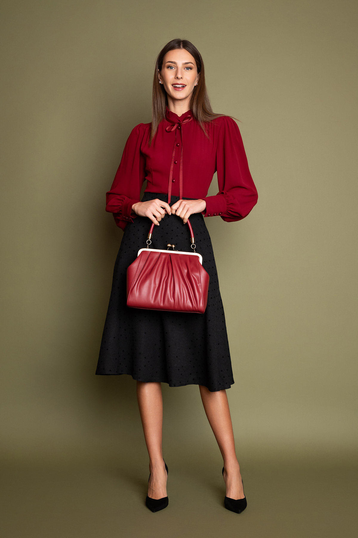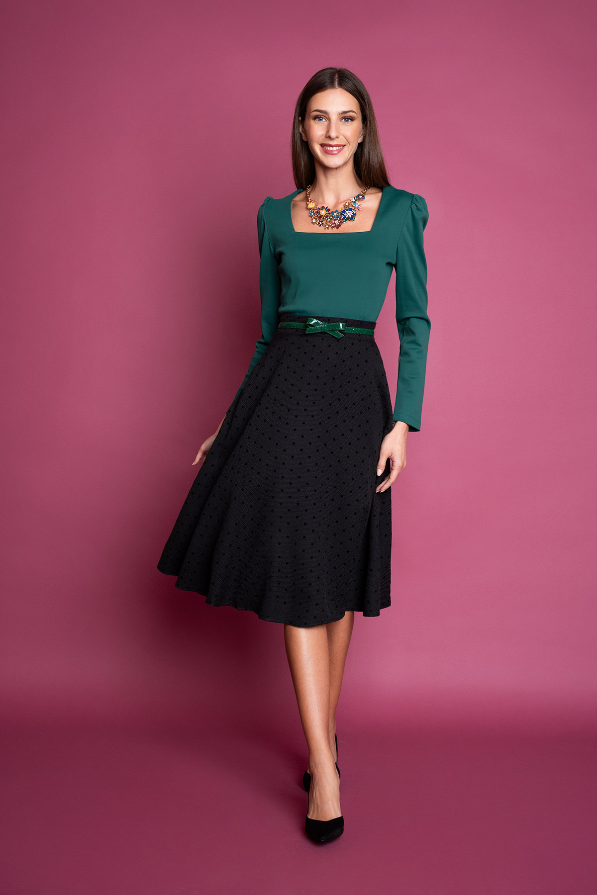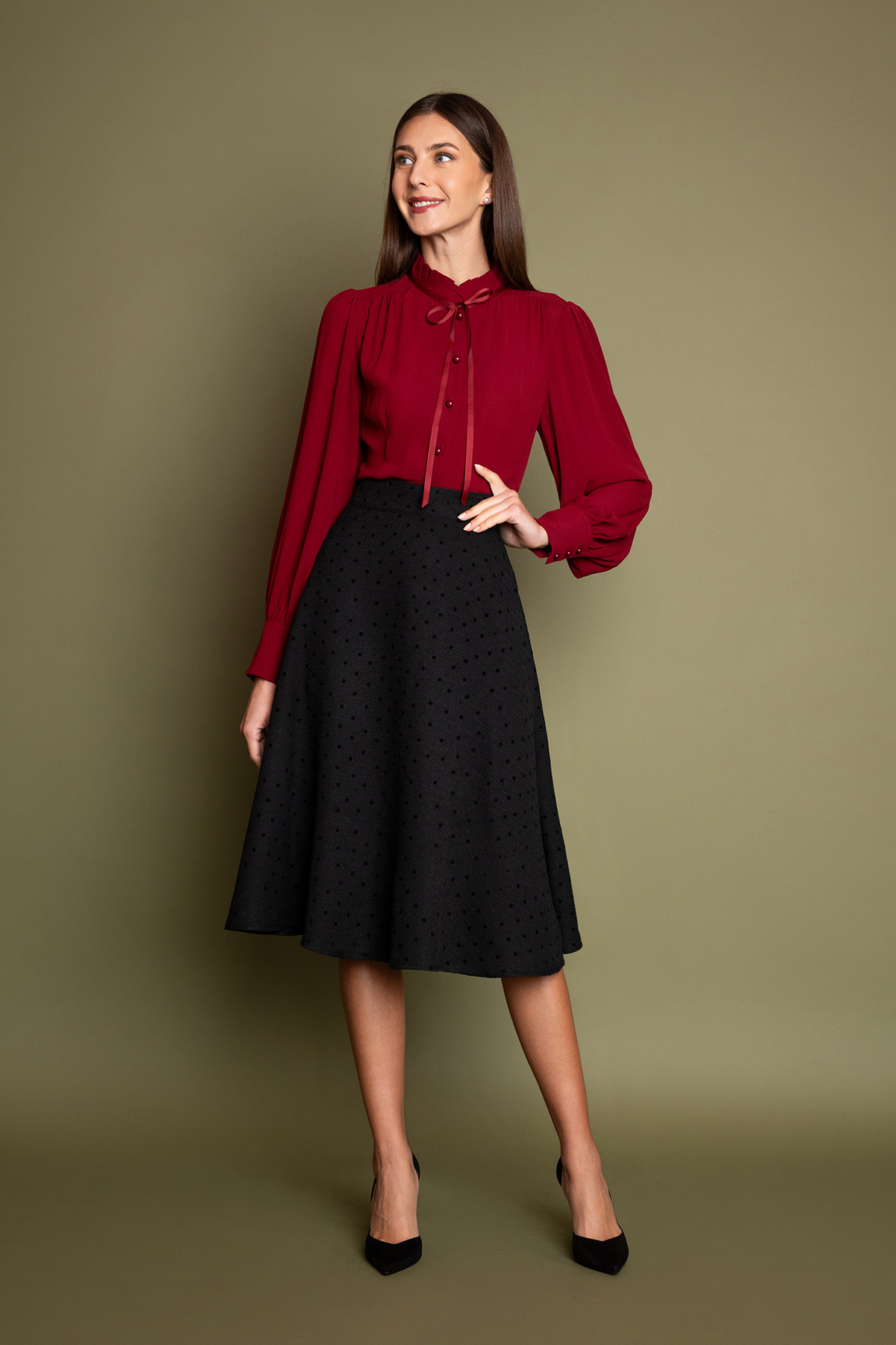 Ψηλόμεση κλος φούστα με μαύρα πουά πάνω σε μαύρο ύφασμα, με τσέπες. Υπέροχη φούστα για να δημιουργήσετε ένα καθημερινό look με ένα πουκάμισο, ή ένα απογευματινό ρετρό look με φουρό και εφαρμοστό τοπ. Με το παιχνιδιάρικο πουά σχέδιο, και τη μεσάτη γραμμή, θα γίνει η αγαπημένη σας φούστα αυτή τη σεζόν, ιδανική για ξεχωριστές εμφανίσεις!