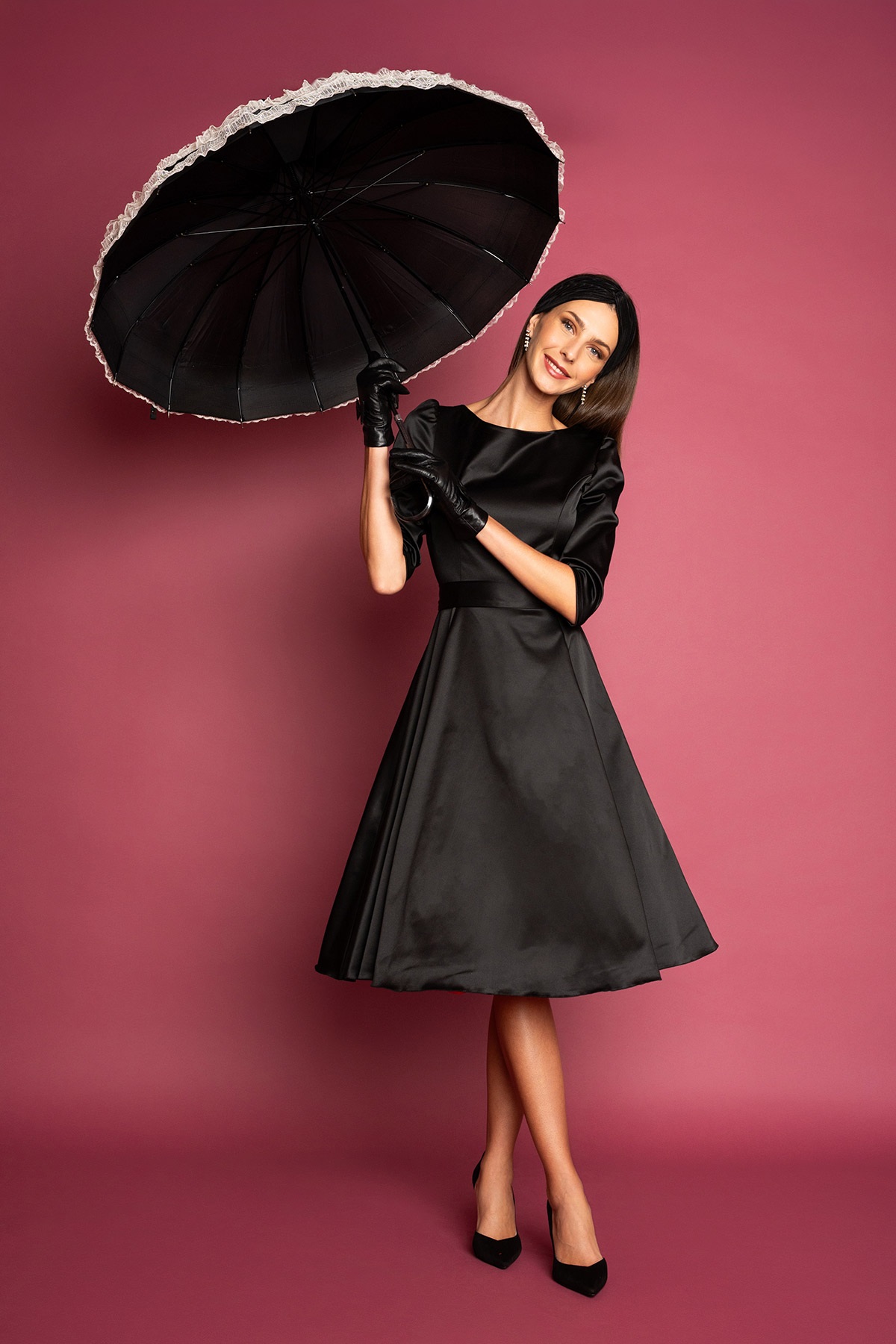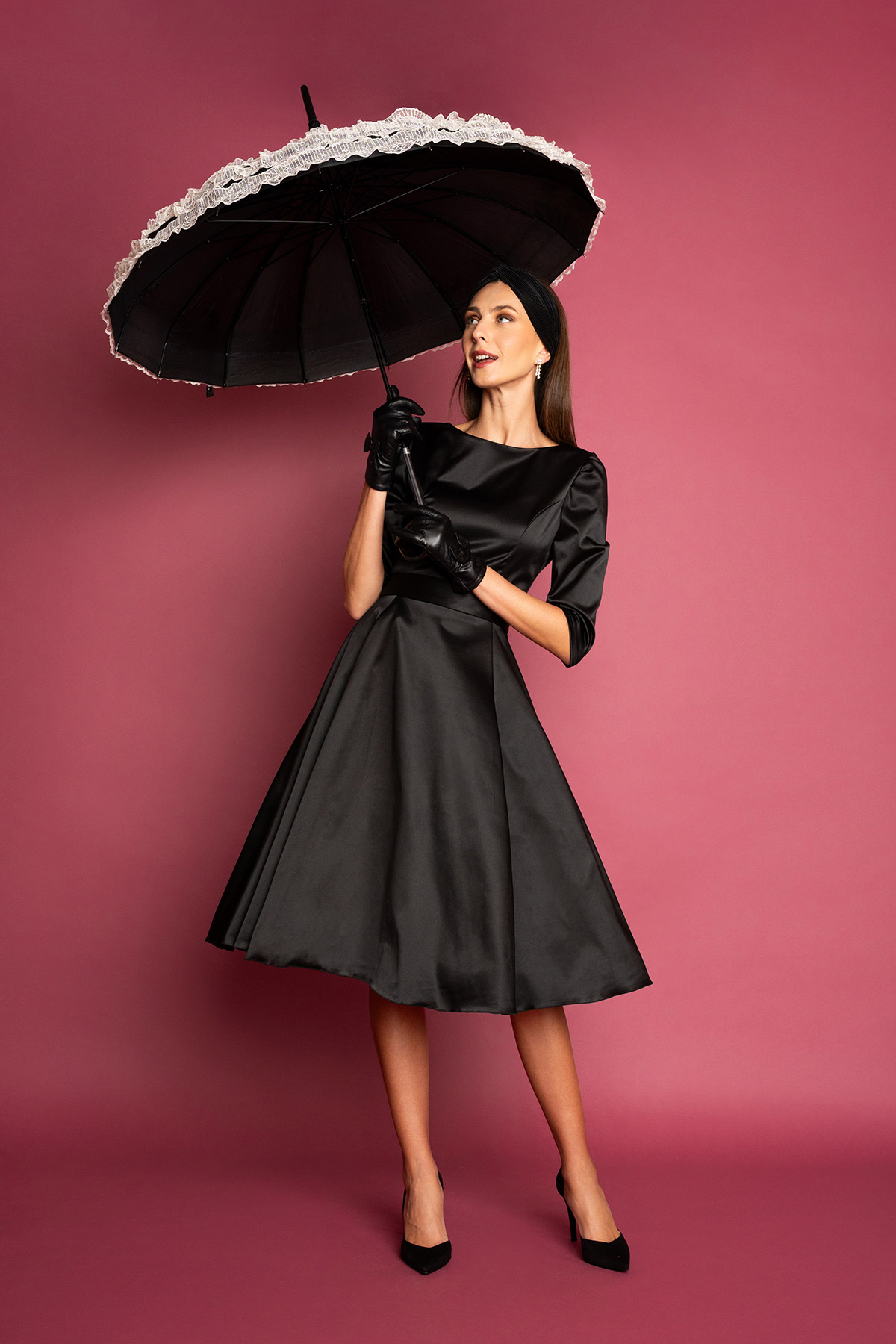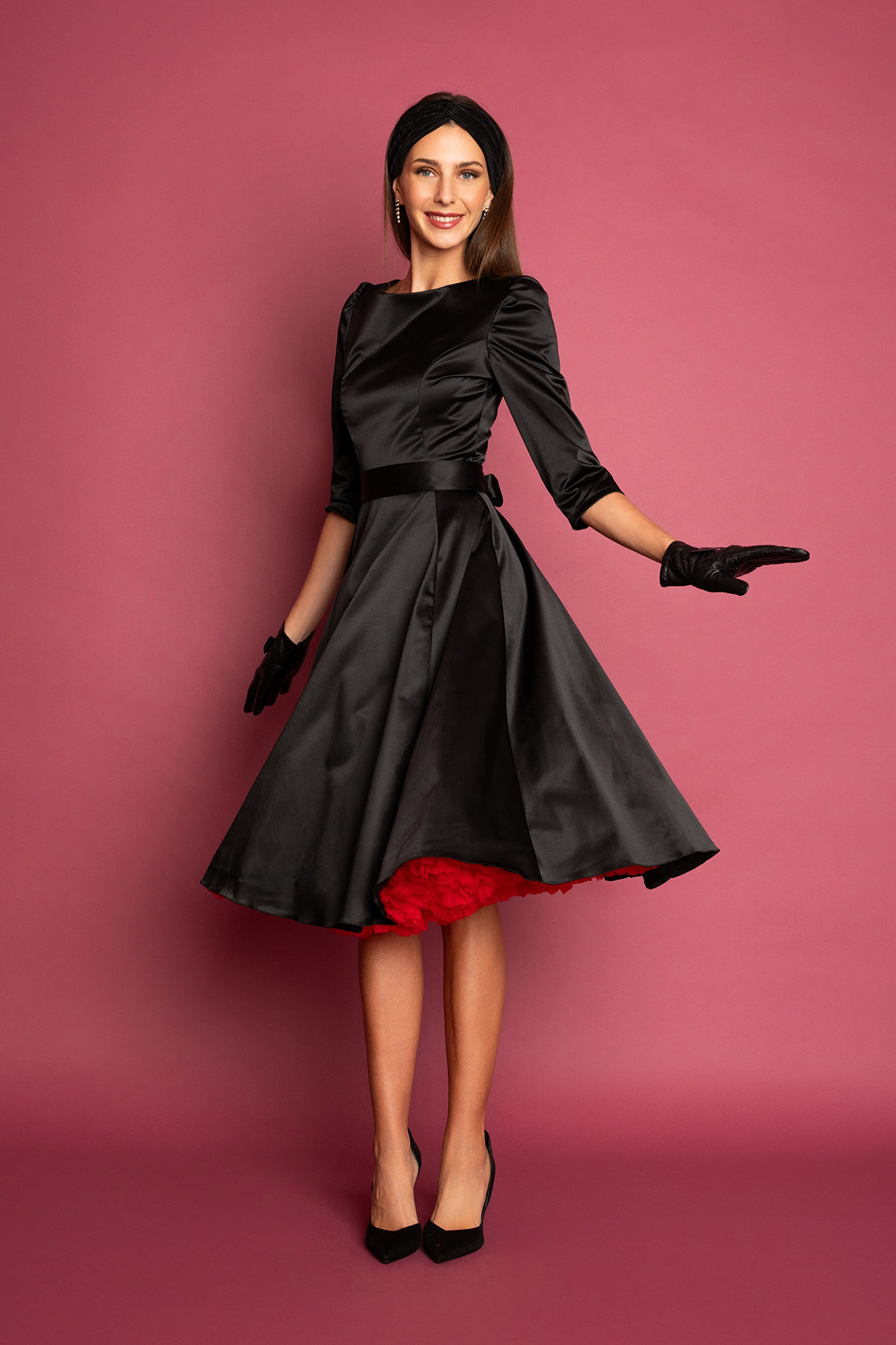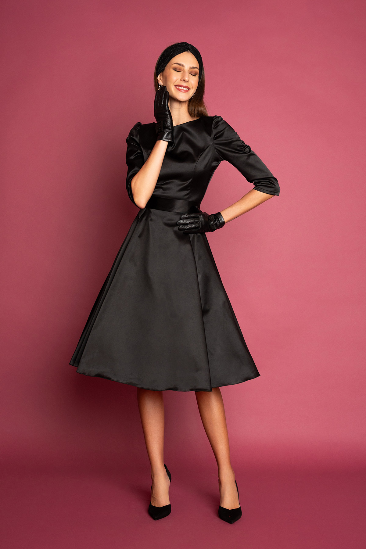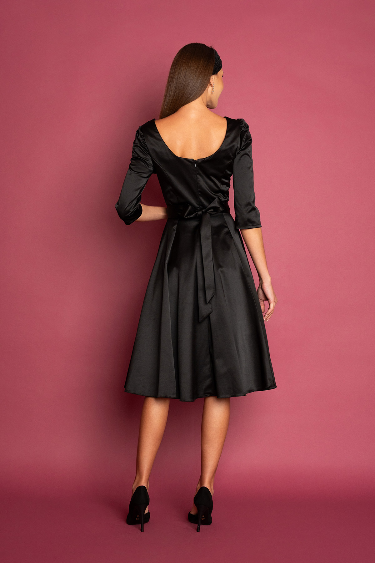 Vintage φόρεμα σε κλος γραμμή, από υπέροχο μαύρο σατέν ύφασμα και μήκος μέχρι το γόνατο. Με 3/4 μανίκια, φουντωτά στους ώμους, λαιμουδιά χαμόγελο και στρογγυλή πλάτη είναι το πιο chic φόρεμα για να συνοδεύσει μια επίσημη εμφάνισή σας. Έχει σατέν κορδέλα για ζώνη στη μέση, που δένει πίσω με φιόγκο. Ιδανικό φόρεμα για γάμο ή οποιαδήποτε ιδιαίτερη περίσταση. Συνδυάστε το με ένα φουρό για πιο εντυπωσιακό αποτέλεσμα, όπως στη φωτογραφία.