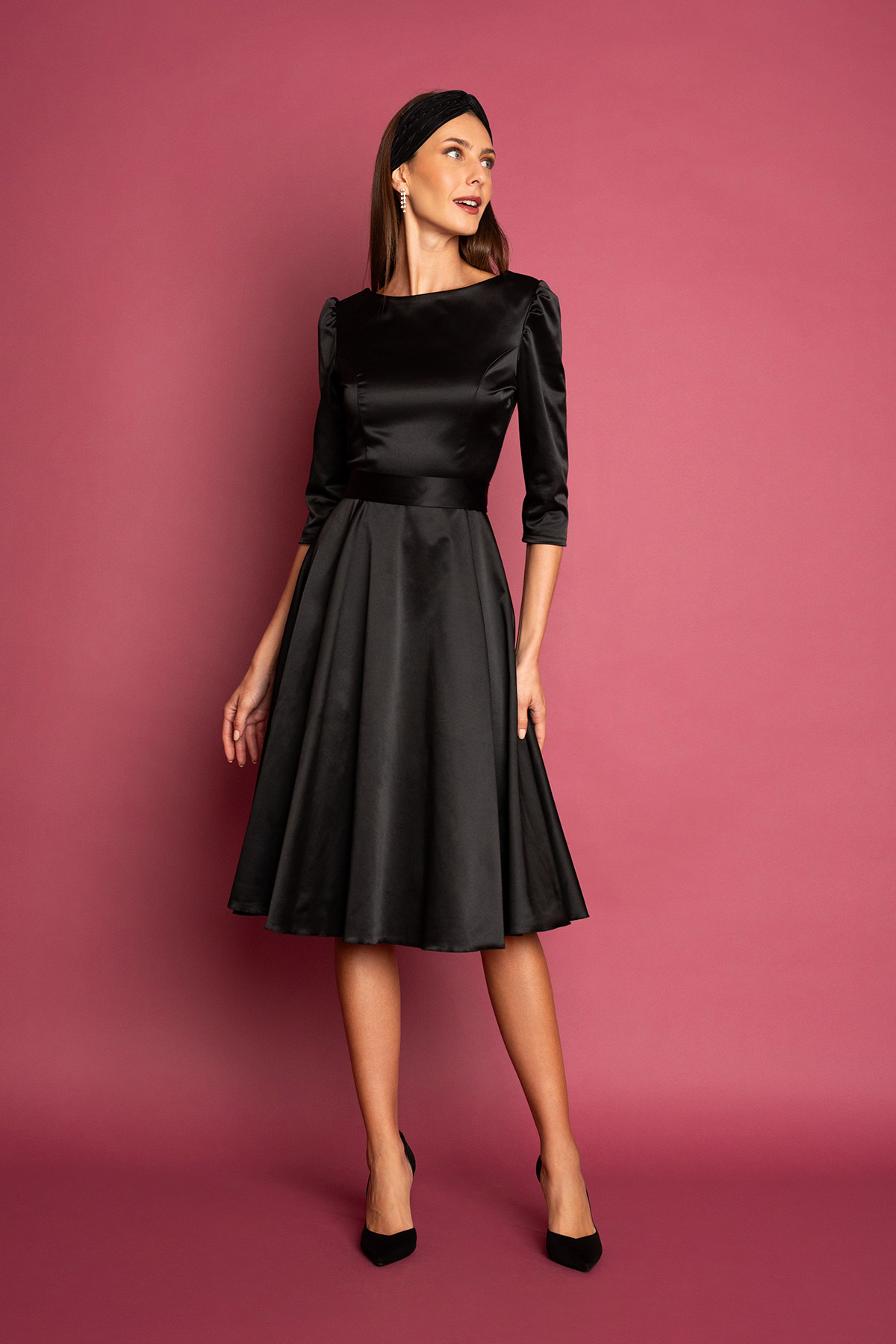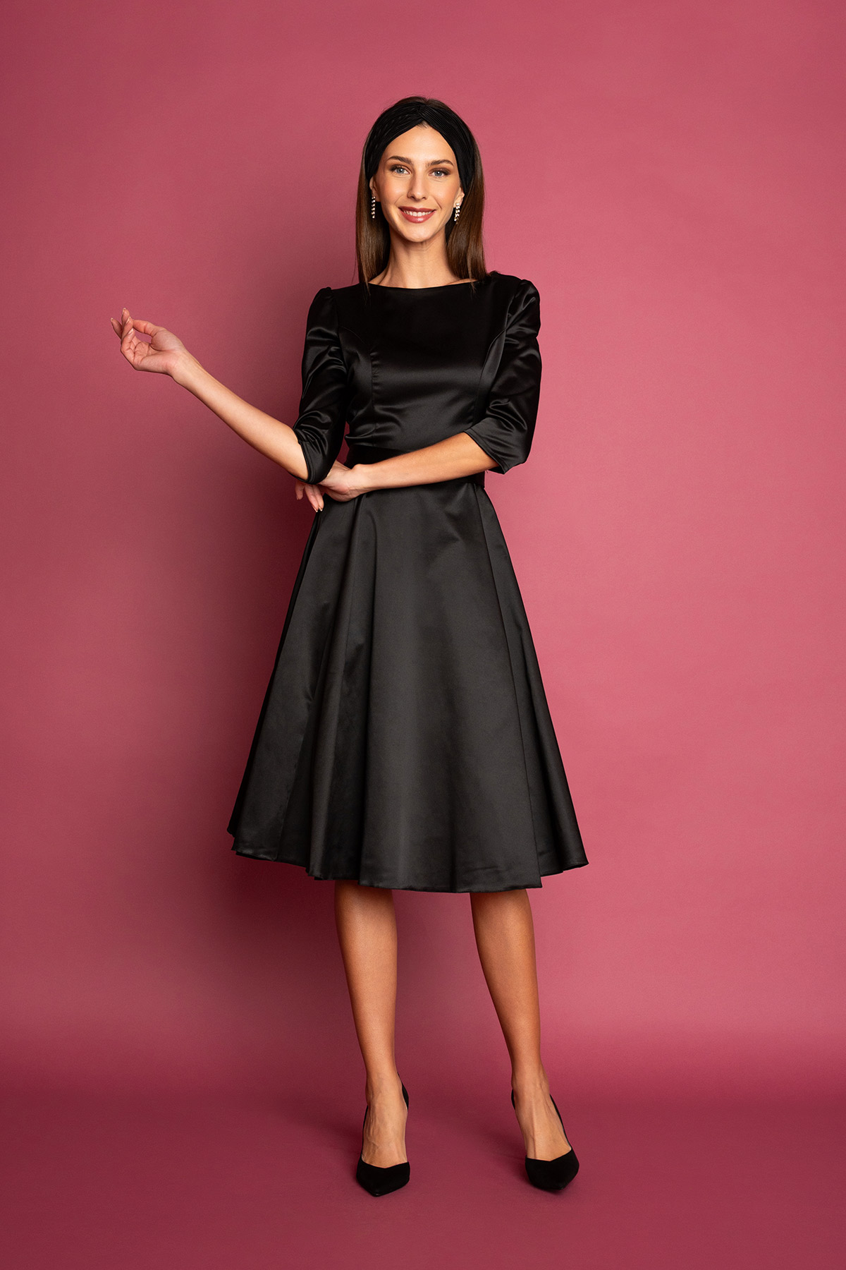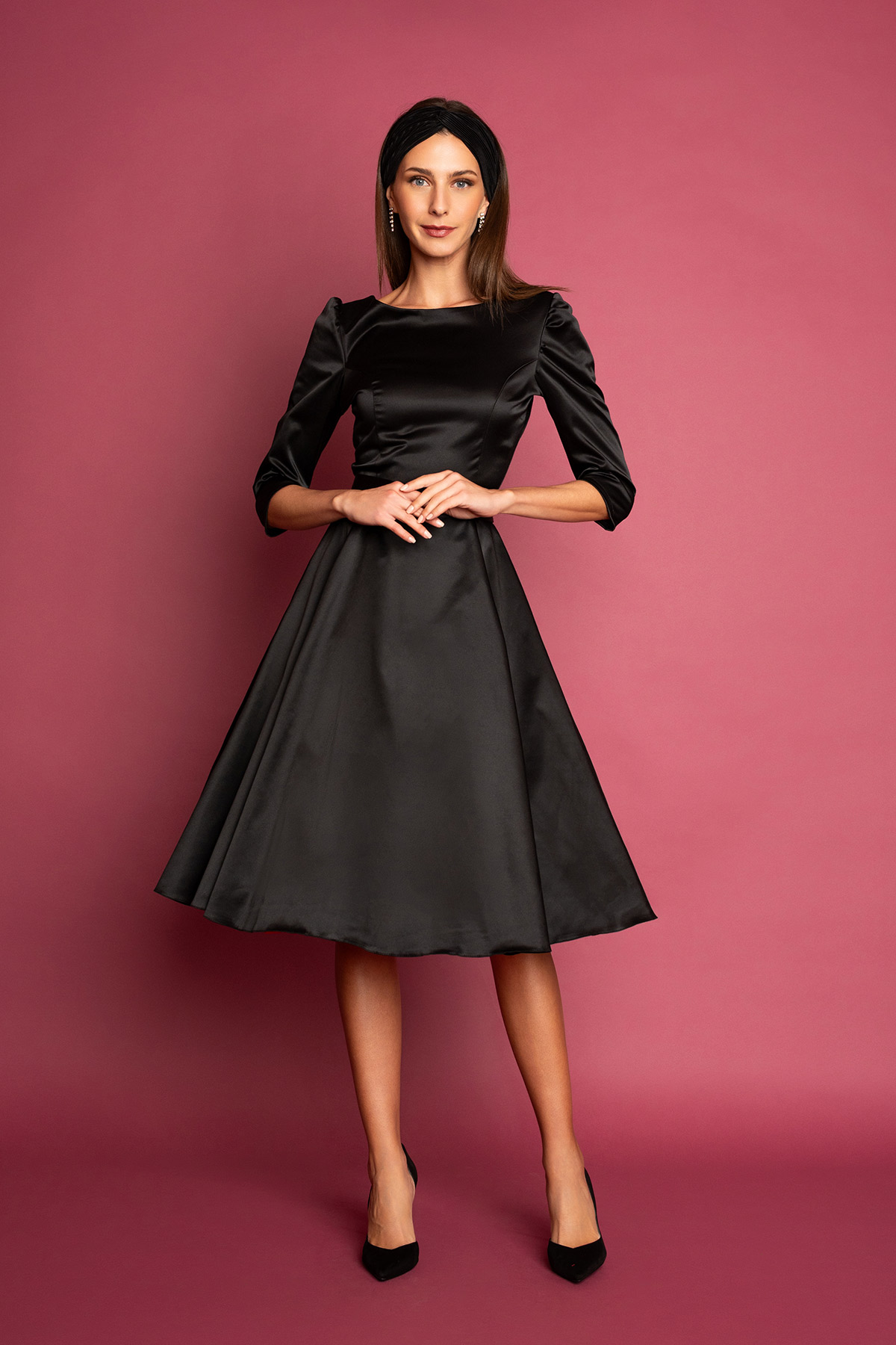 Vintage φόρεμα σε μεσάτη γραμμή, από υπέροχο μαύρο σατέν ύφασμα και μήκος μέχρι το γόνατο, 3/4 μανίκια, λαιμουδιά χαμόγελο και στρογγυλή πλάτη είναι το πιο chic φόρεμα για να συνοδεύσει μια επίσημη εμφάνισή σας.
