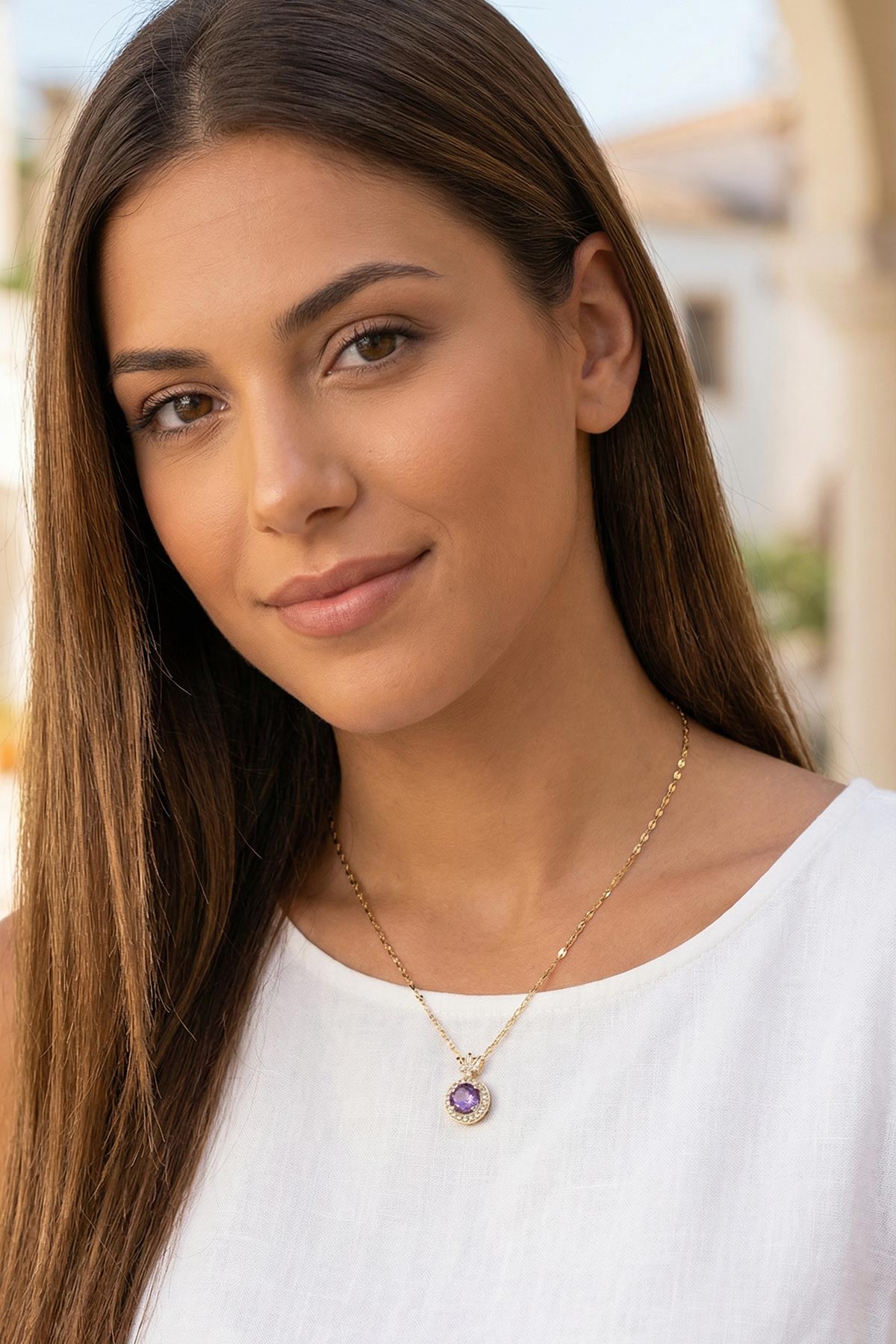 Μεταγιόν σε στυλ ροζέτας, με κεντρική πέτρα ζιργκόν σε μωβ χρώμα και λεπτομέρειες ζιργκόν περιμετρικά. Ο κρίκος είναι διακοσμημένος με στέμμα και μικρά ζιργκόν. Υπέροχο κρεμαστό από επίχρυσο ανοξείδωτο ατσάλι με elegant σχεδιασμό, ιδανικό για εμφανίσεις που θέλετε να ξεχωρίζουν!