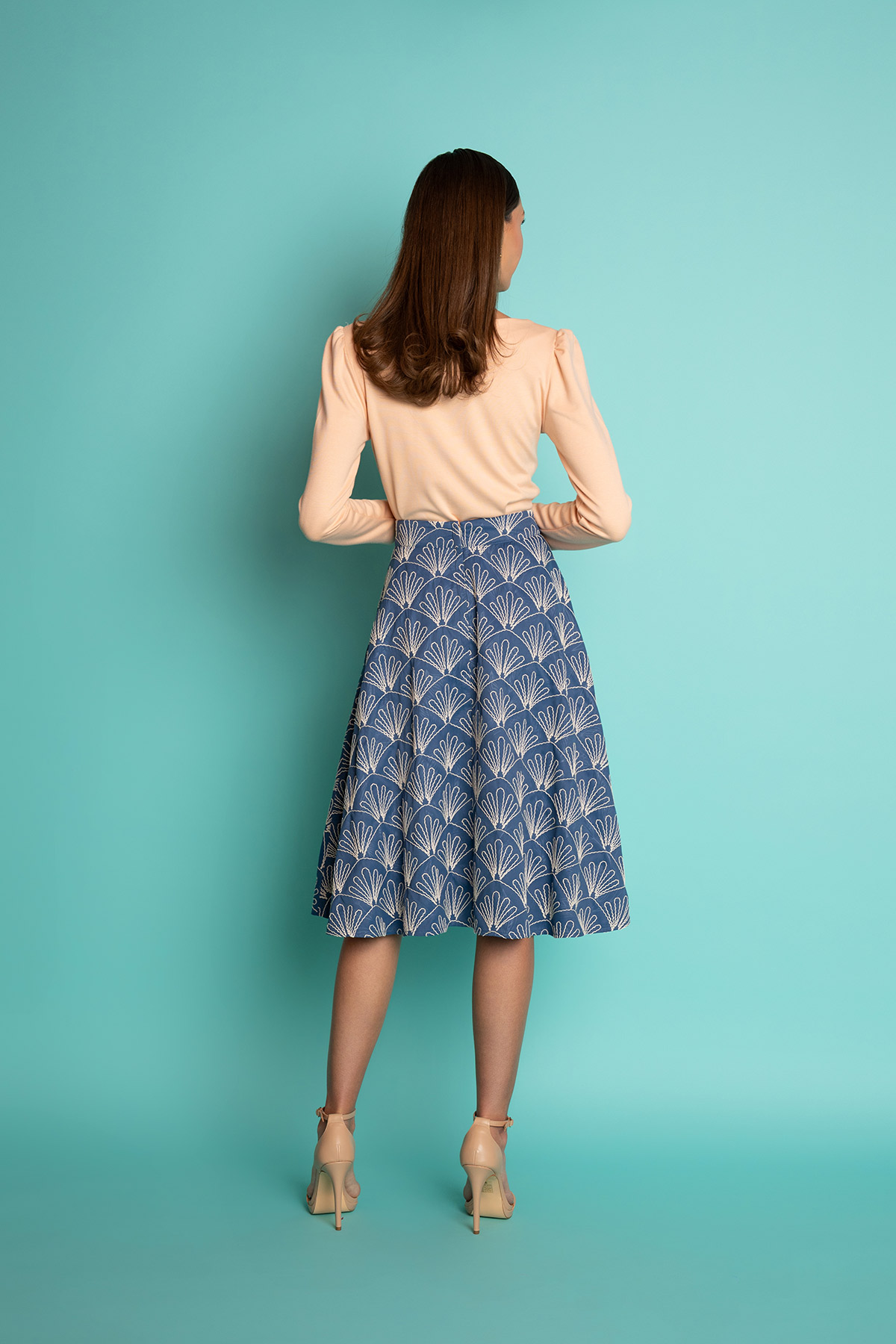 Μίντι ψηλόμεση κλος φούστα από μαλακό ύφασμα μέχρι το γόνατο. Υπέροχη swing φούστα, σε κλος γραμμή, με κεντημένα κοχύλια πάνω σε μπλε φόντο, για να δημιουργήσετε ένα ρετρό look με ένα crop top, φουρό και πέδιλα. Ιδανική κλος φούστα για τη σεζόν, για εντυπωσιακές εμφανίσεις!