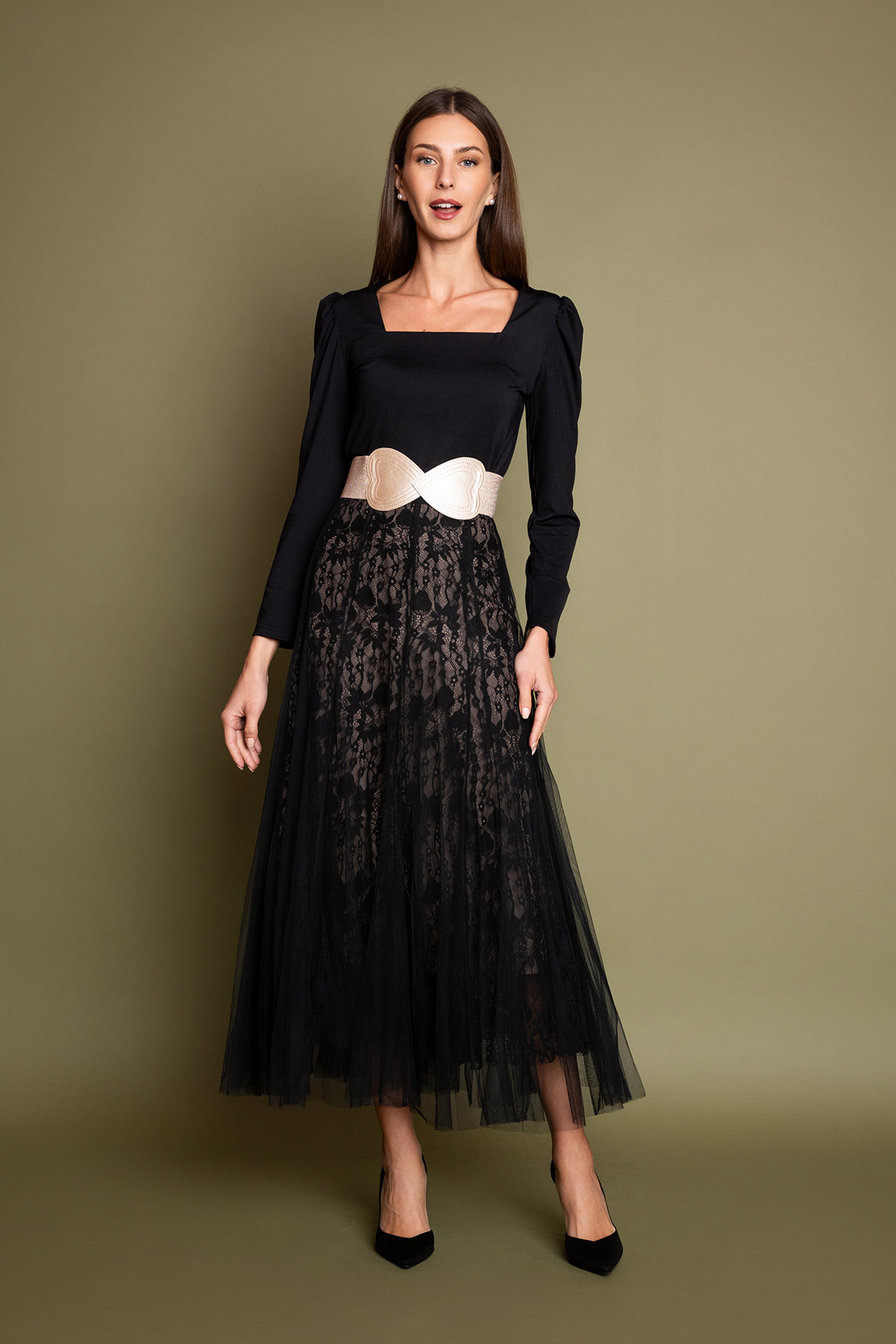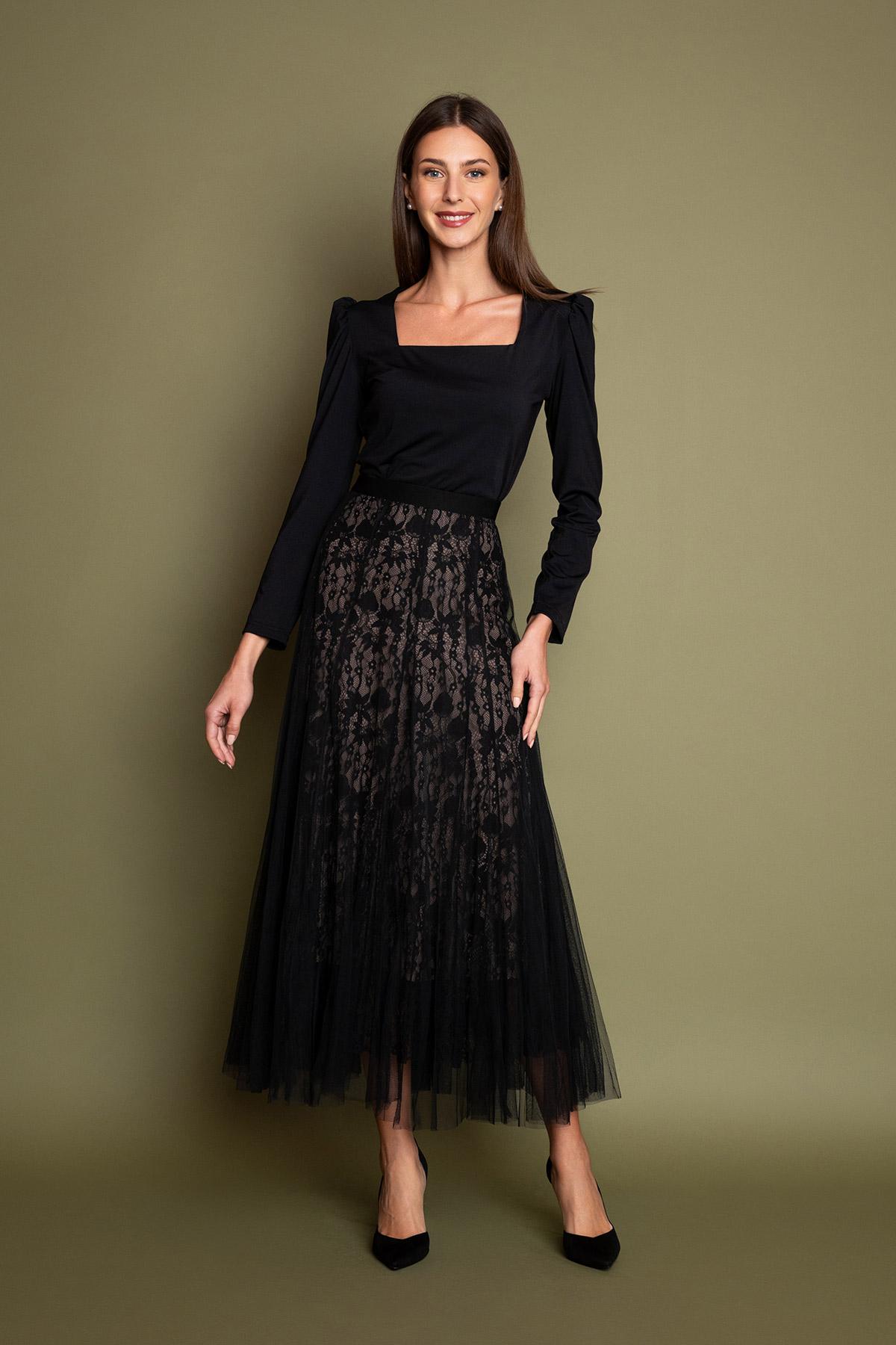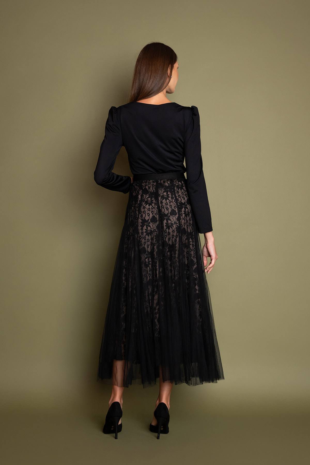 Ψηλόμεση μίντι φούστα από μαύρο τούλι και δαντέλα πάνω σε nude φόδρα, με λάστιχο στη μέση και αέρινη κίνηση, για μια ρομαντική εμφάνιση.