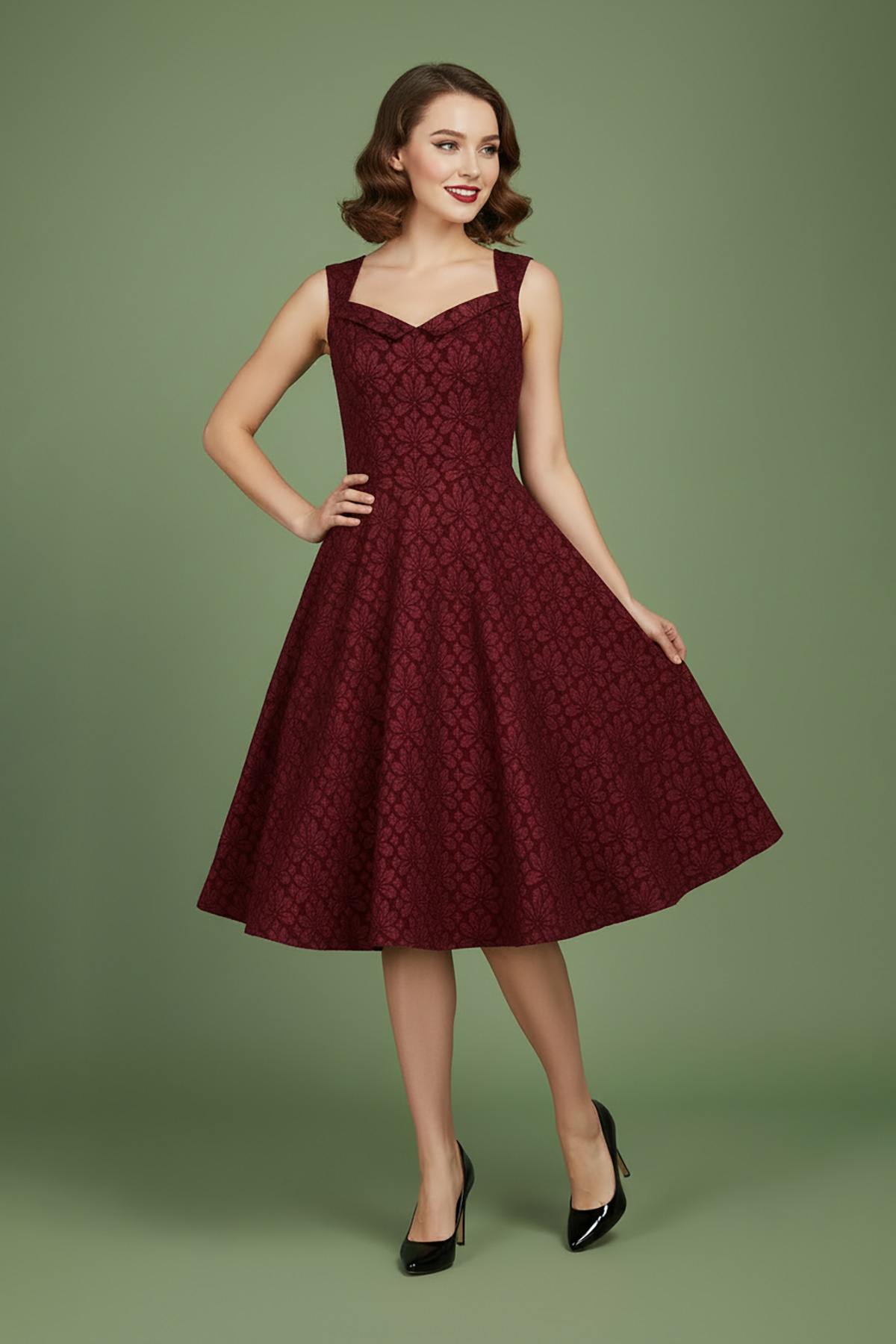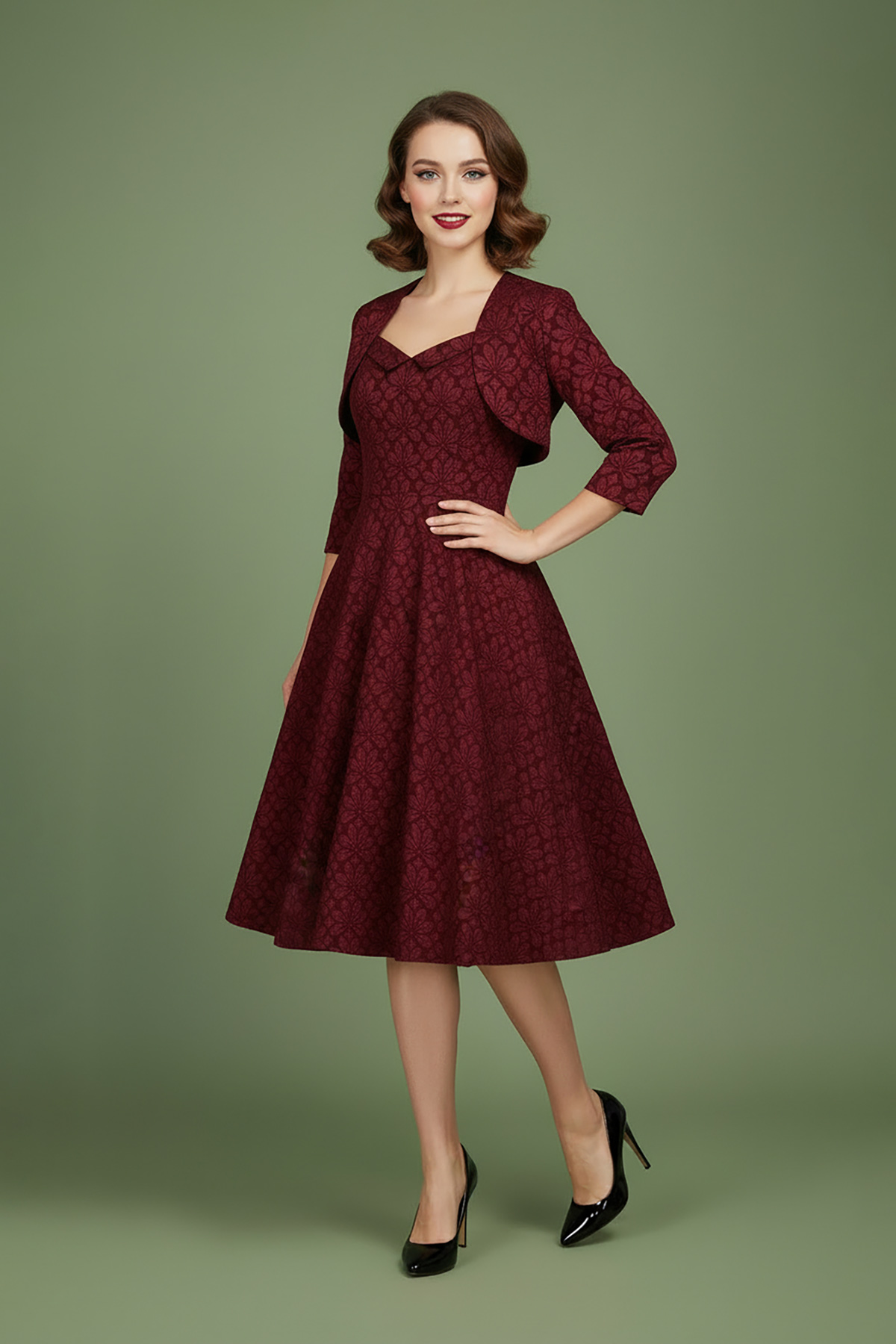 Απολαύστε τη διαχρονική κομψότητα με το midi κλος φόρεμα με μπολερό, εμπνευσμένο από το vintage στυλ, σε μια πλούσια απόχρωση κρασιού και διακοσμημένο με ένα εξαιρετικό ανάγλυφο φλοράλ print. Το φόρεμα διαθέτει ένα κολακευτικό εφαρμοστό μπούστο που τονίζει τη μέση, που καταλήγει σε μια φαρδιά φούστα για χαριτωμένη κίνηση. Ένα εκλεπτυσμένο ντεκολτέ με πέτο προσθέτει μια πινελιά ρετρό γοητείας, ενώ το ασορτί μπολερό που περιλαμβάνεται ολοκληρώνει την sophisticated εμφάνιση. Ιδανικό για επίσημες περιστάσεις ή για μια κομψή δήλωση οποιαδήποτε μέρα της εβδομάδας.