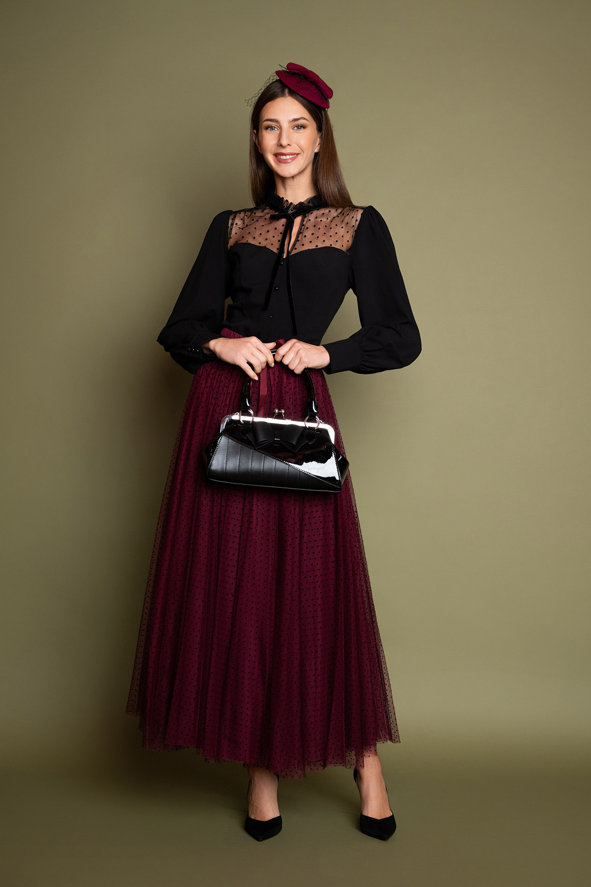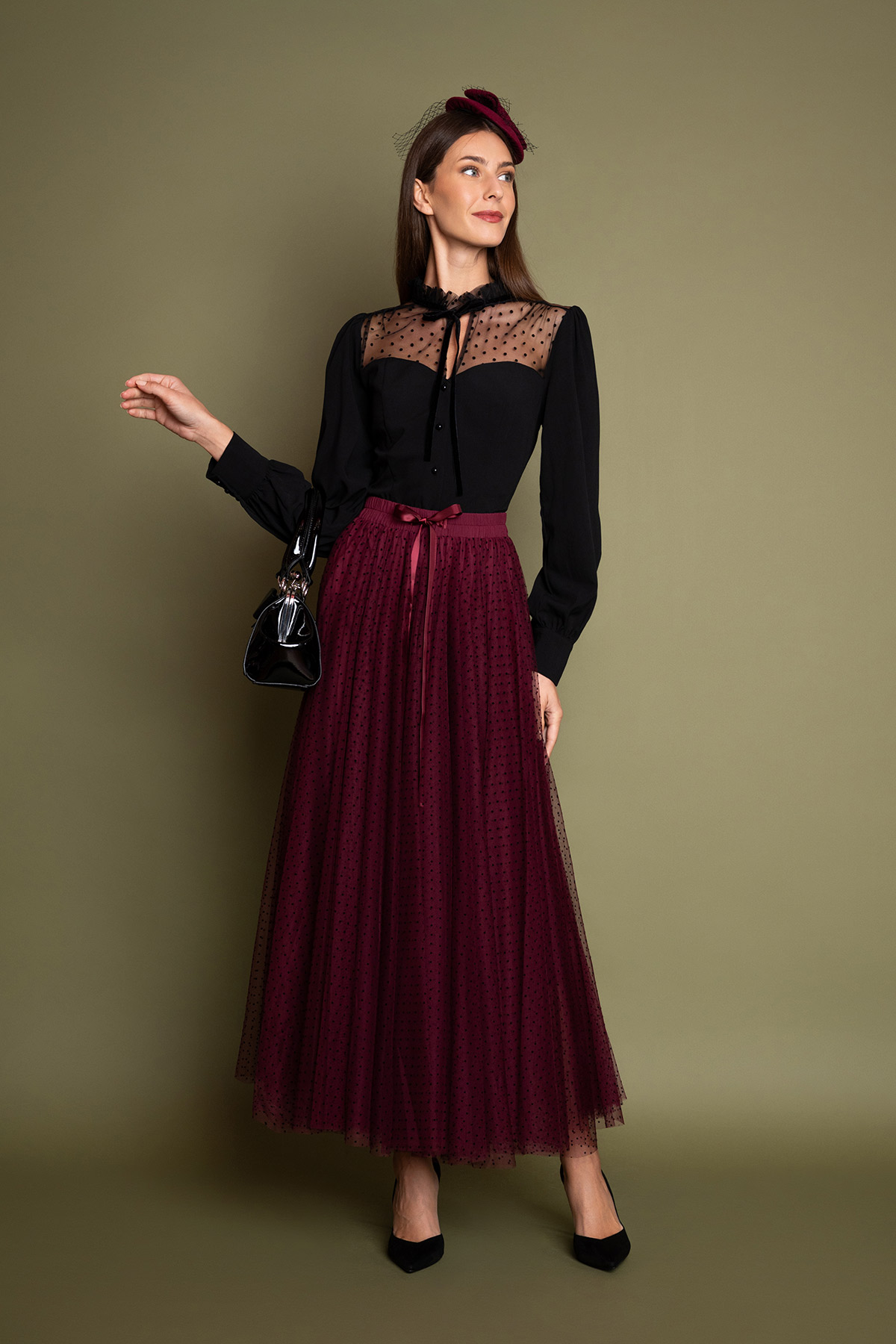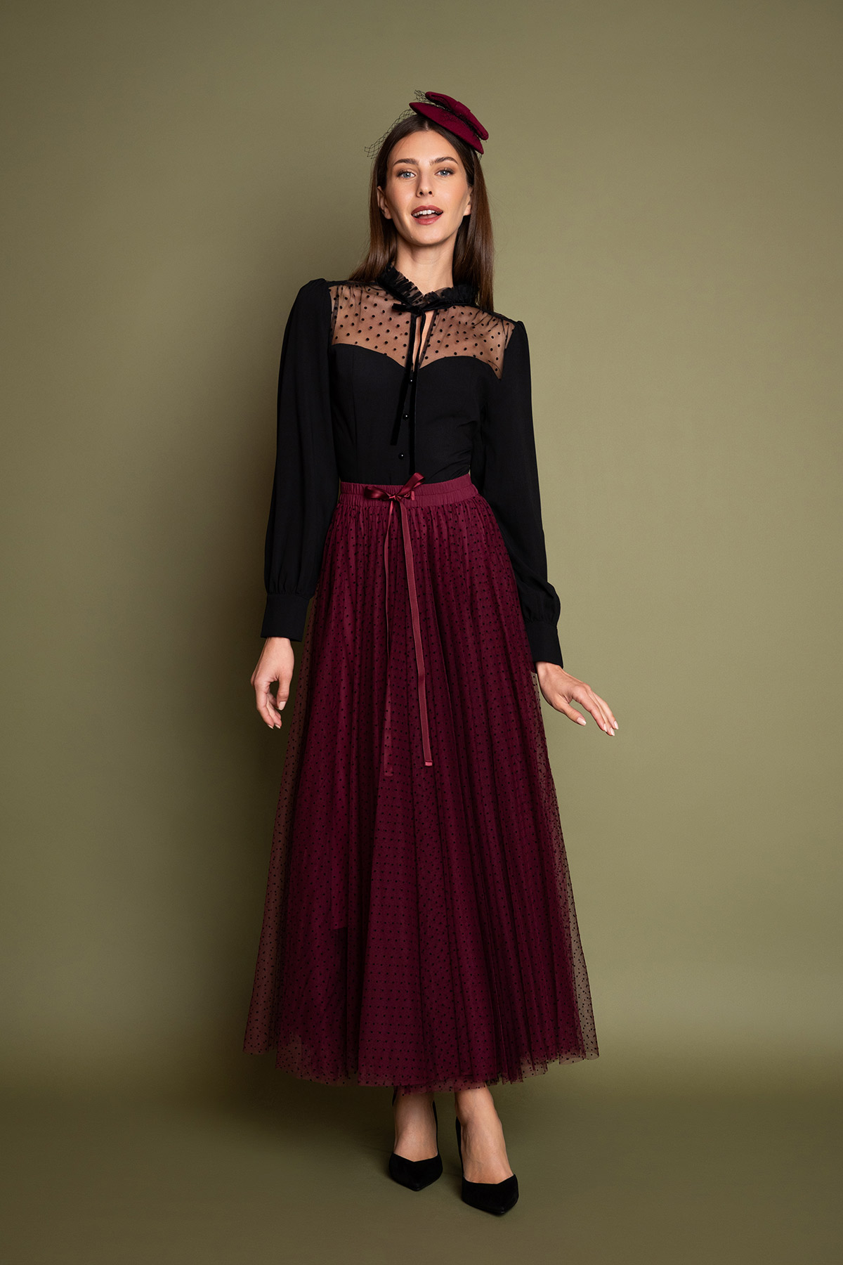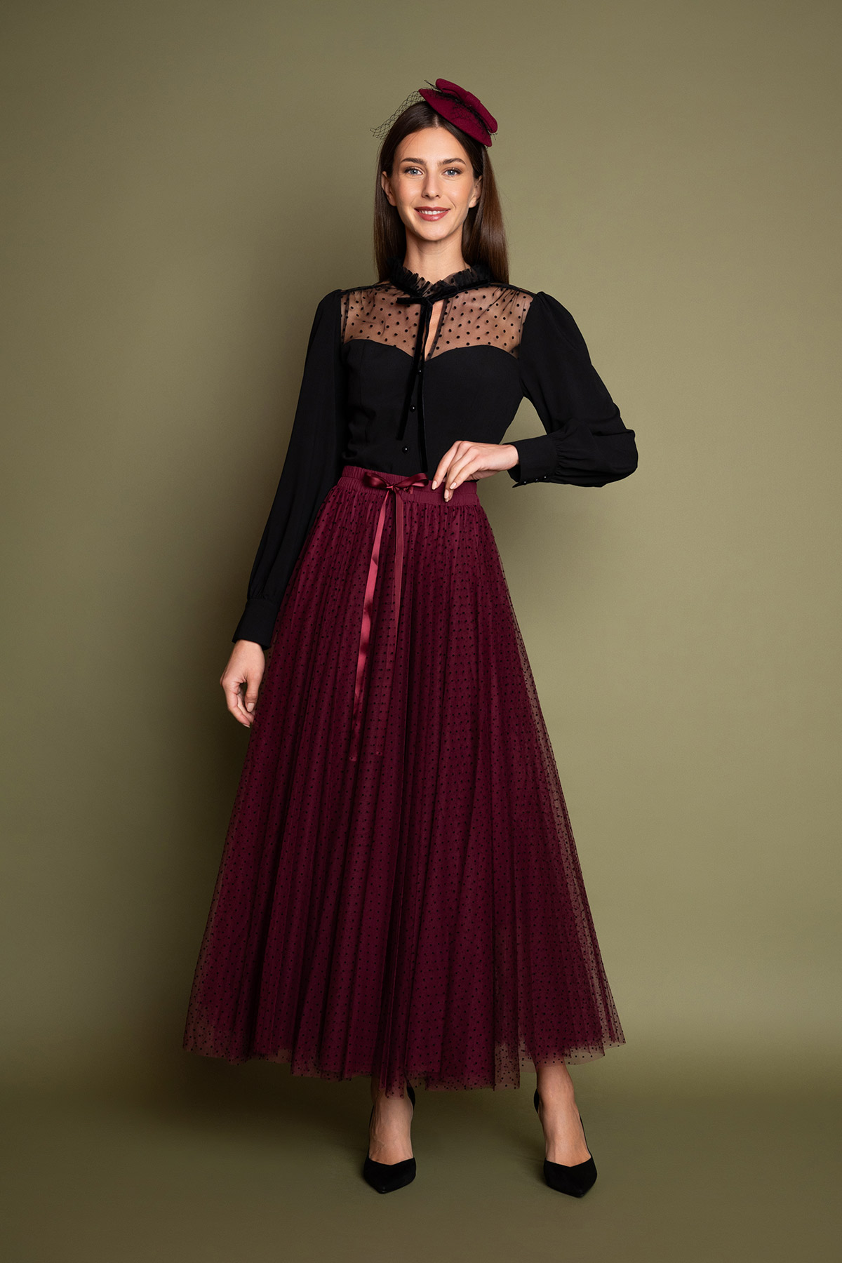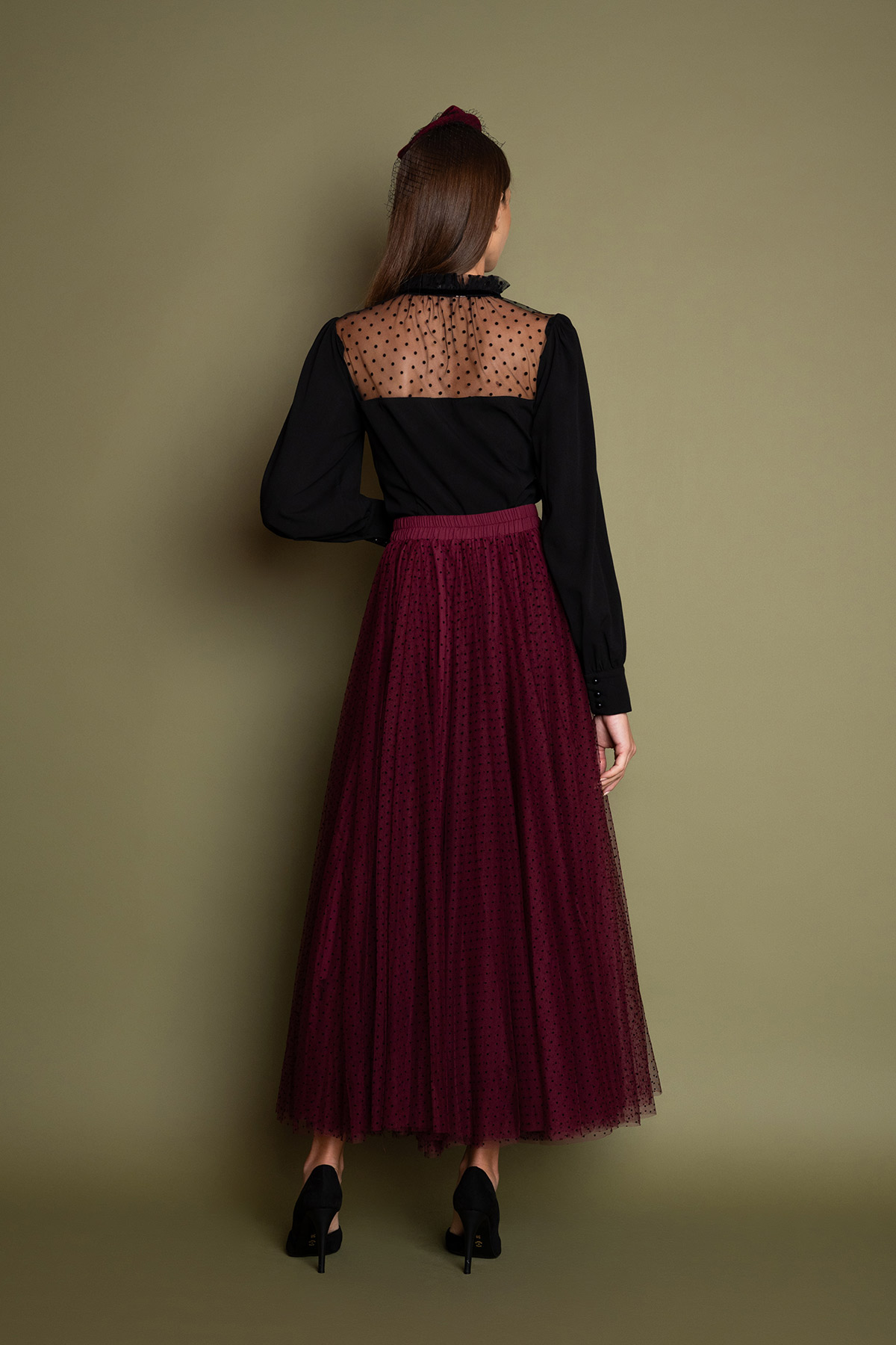 Midi φούστα από μαλακό τούλι σε μπορντό χρώμα, με μαύρα πουά, με φόδρα εσωτερικά και ελαστική μέση με κορδελάκι. Υπέροχη ρομαντική αέρινη φούστα για εντυπωσιακές επίσημες εμφανίσεις. Συνδυάστε τη με ένα εφαρμοστό top και δημιουργήστε ένα διαχρονικό και chic look.