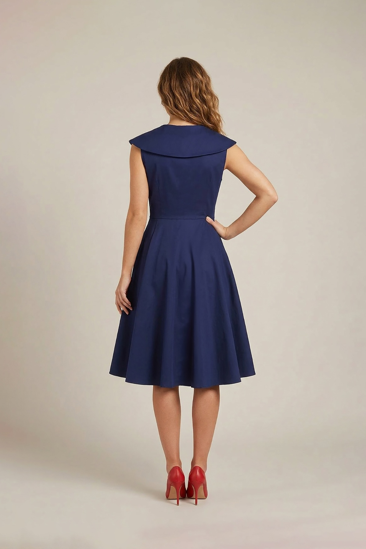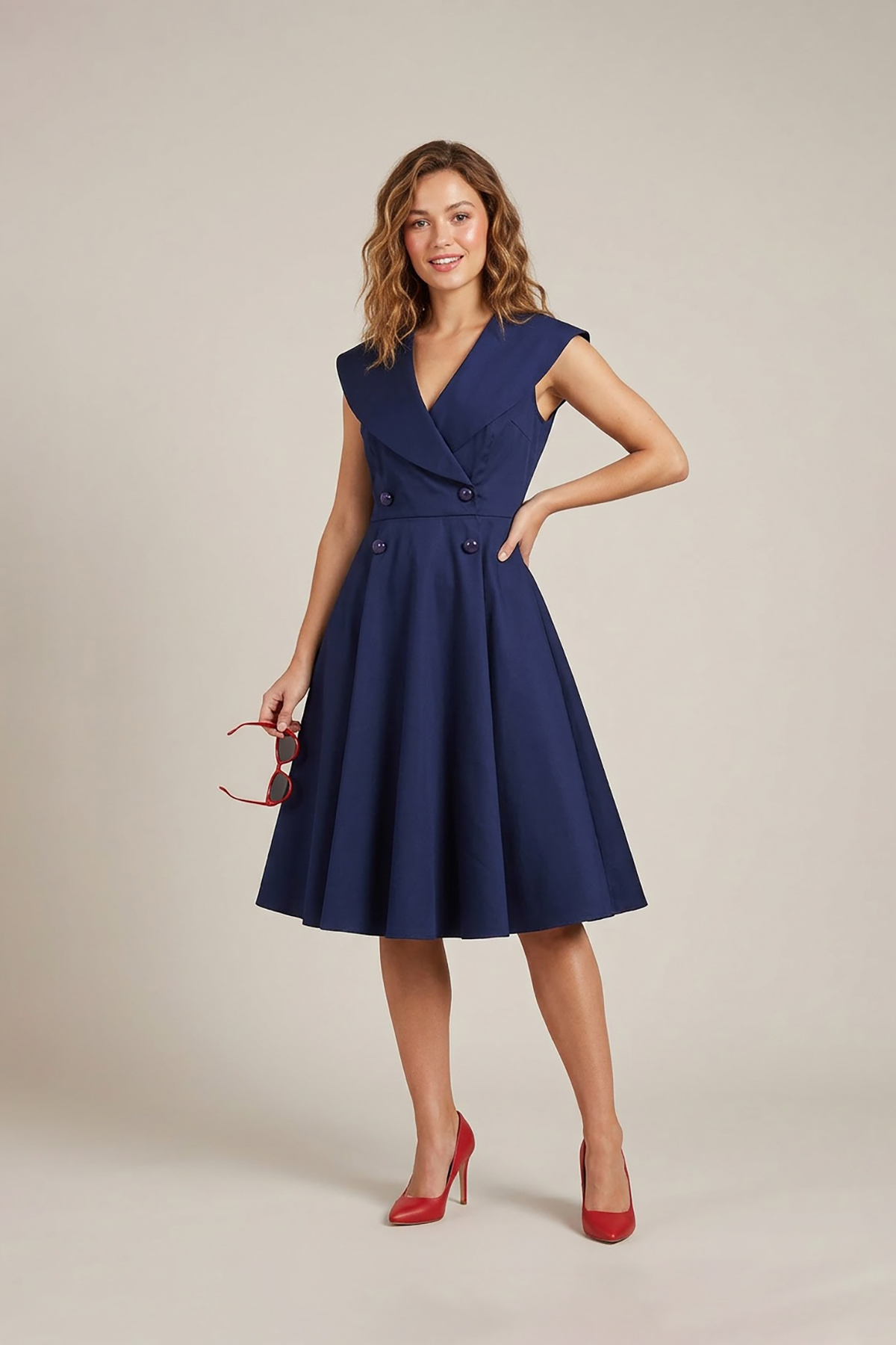 Εμπνευσμένο από τη δεκαετία του 1950, το ναυτικό φόρεμα της συλλογής μας προσφέρει μια καθαρή, κλασική σιλουέτα που κολακεύει κάθε σωματότυπο. Με τον εντυπωσιακό του γιακά και τη θηλυκή κλός γραμμή, είναι το ιδανικό φόρεμα για να δημιουργήσετε ένα chic navy look που αποπνέει φινέτσα και αυτοπεποίθηση.