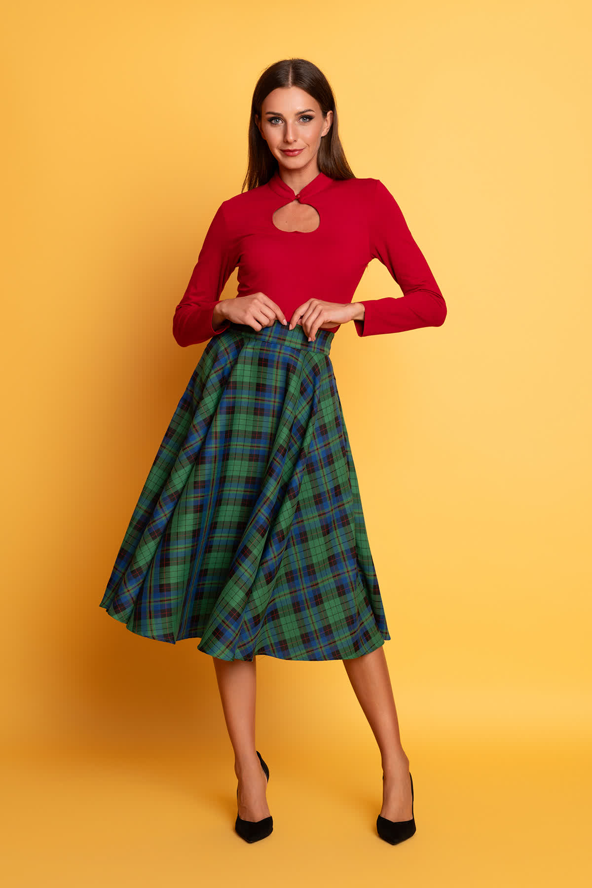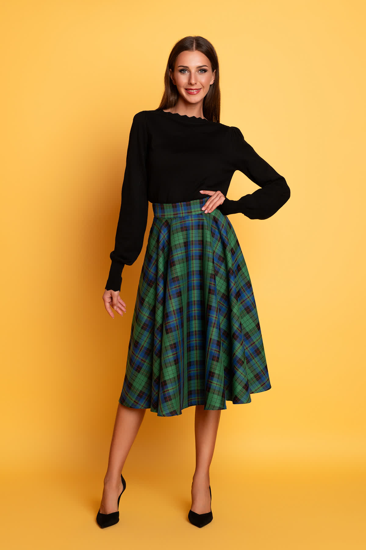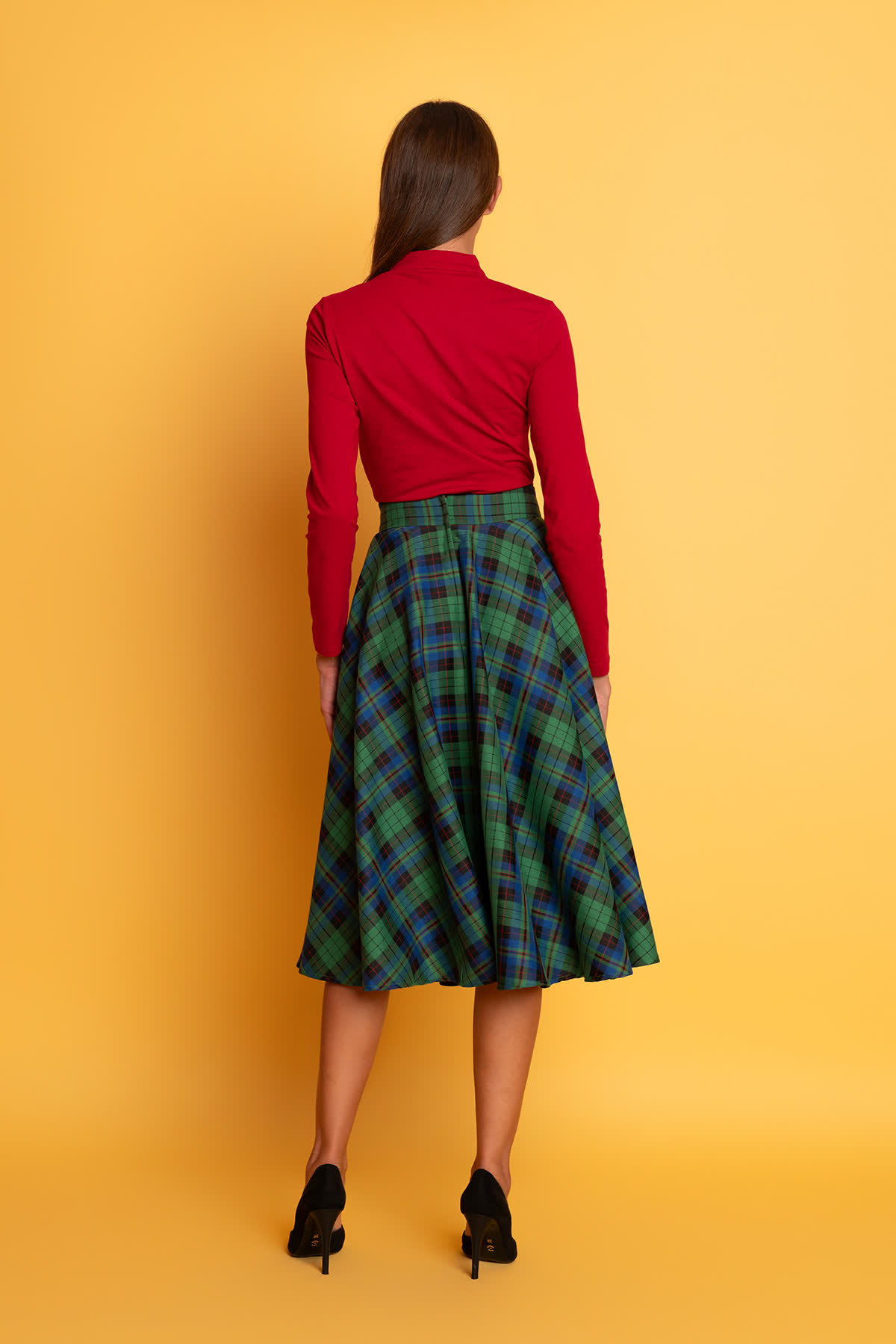 Μίντι ψηλόμεση κλος φούστα με καρό μοτίβο στις αποχρώσεις του πράσινου, μπλε και μαύρου, με κρυφές τσέπες και μήκος μέχρι το γόνατο. Υπέροχη φούστα για να δημιουργήσετε ένα casual look με ένα πουλόβερ και σνίκερς, ή ένα απογευματινό ρετρό look με φουρό και πουκάμισο. Ιδανική κλος φούστα για τη σεζόν που έρχεται, για όλες τις ώρες!
