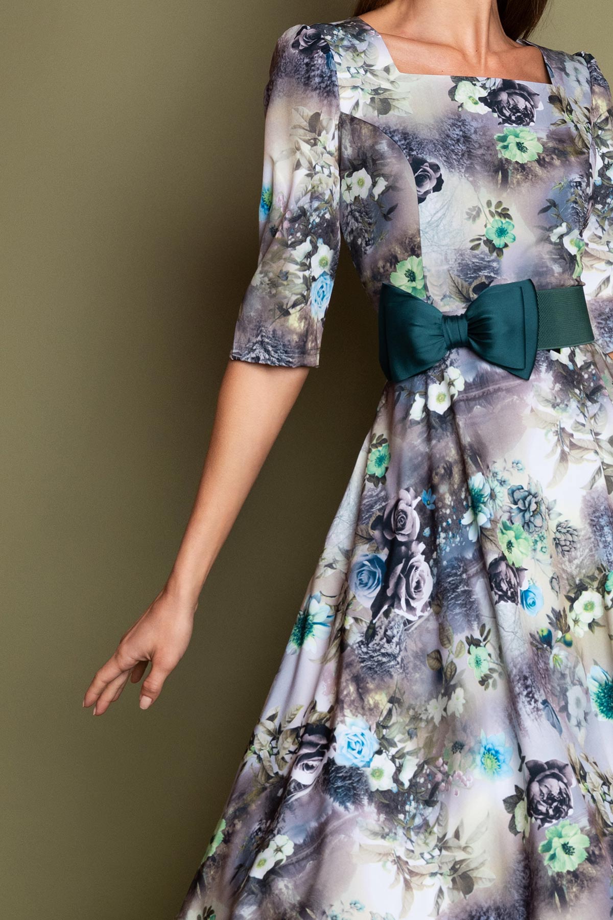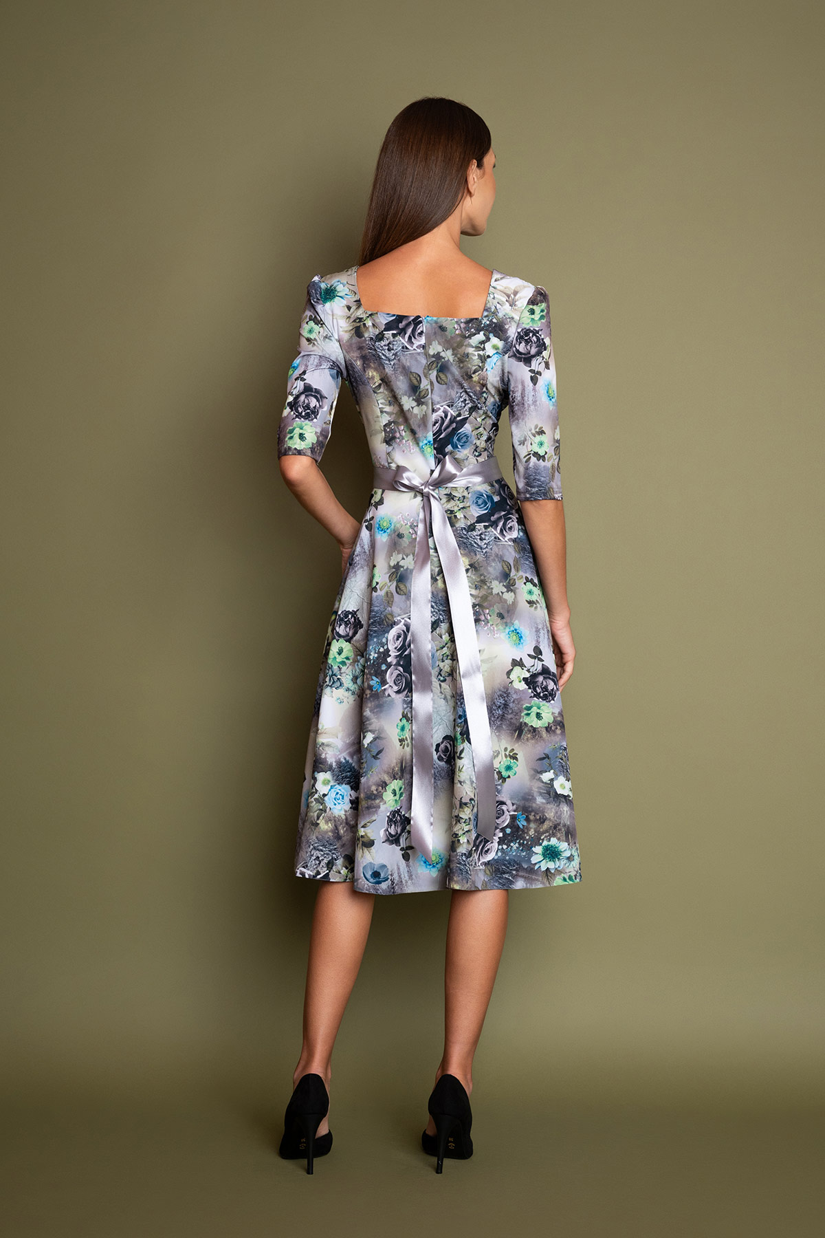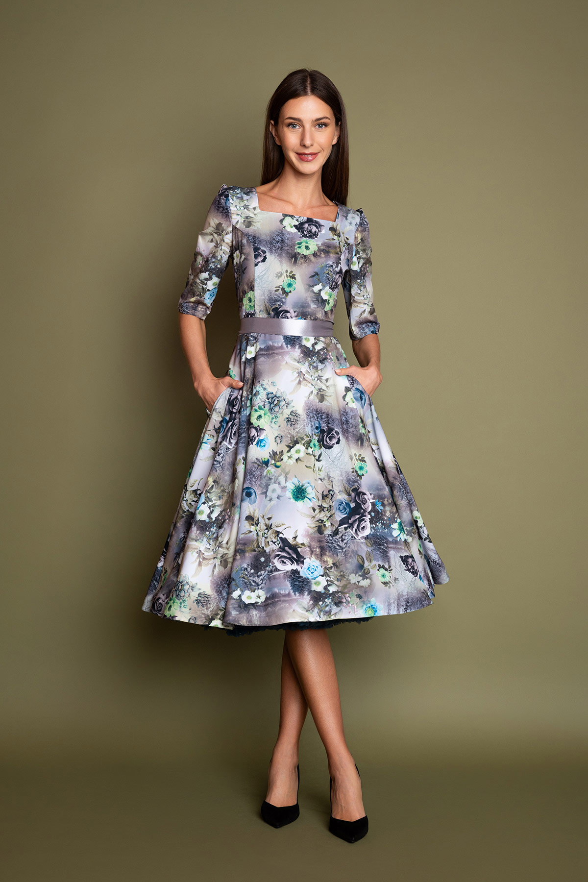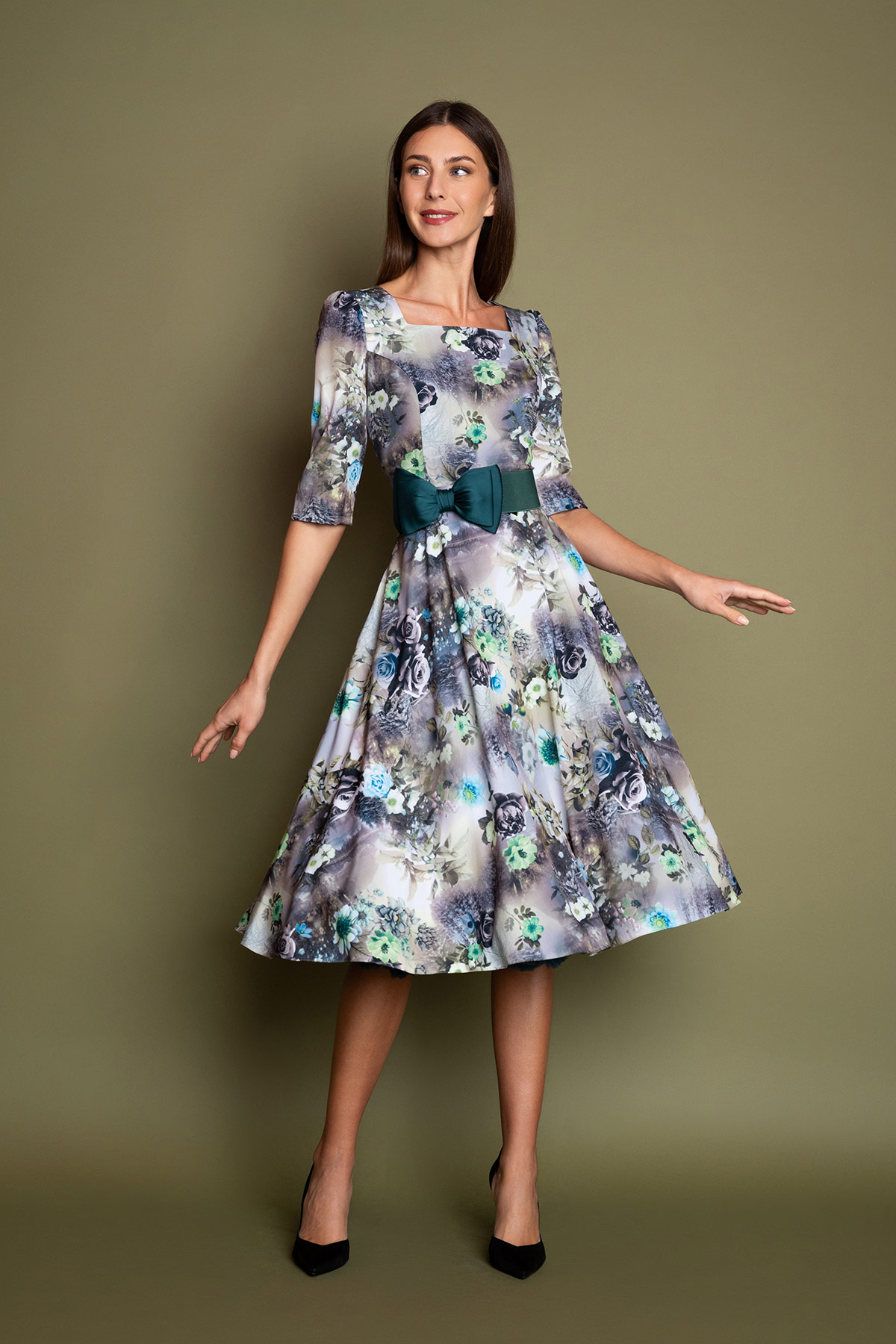 Κλος φλοράλ φόρεμα από υπέροχο φλοράλ σατινέ ύφασμα, με τετράγωνη λαιμουδιά και πλάτη, κοντά μανίκια και σατέν ζωνάκι στη μέση που δένει πίσω με φιόγκο. Η μεσάτη γραμμή τονίζει τη σιλουέτα και το μαλακό και αέρινο ύφασμα δίνει την υπέροχη κίνηση για το απόλυτα ρετρό φόρεμα. Συνδυάστε το με ένα φουρό και ψηλές γόβες για το αποτέλεσμα της φωτογραφίας!