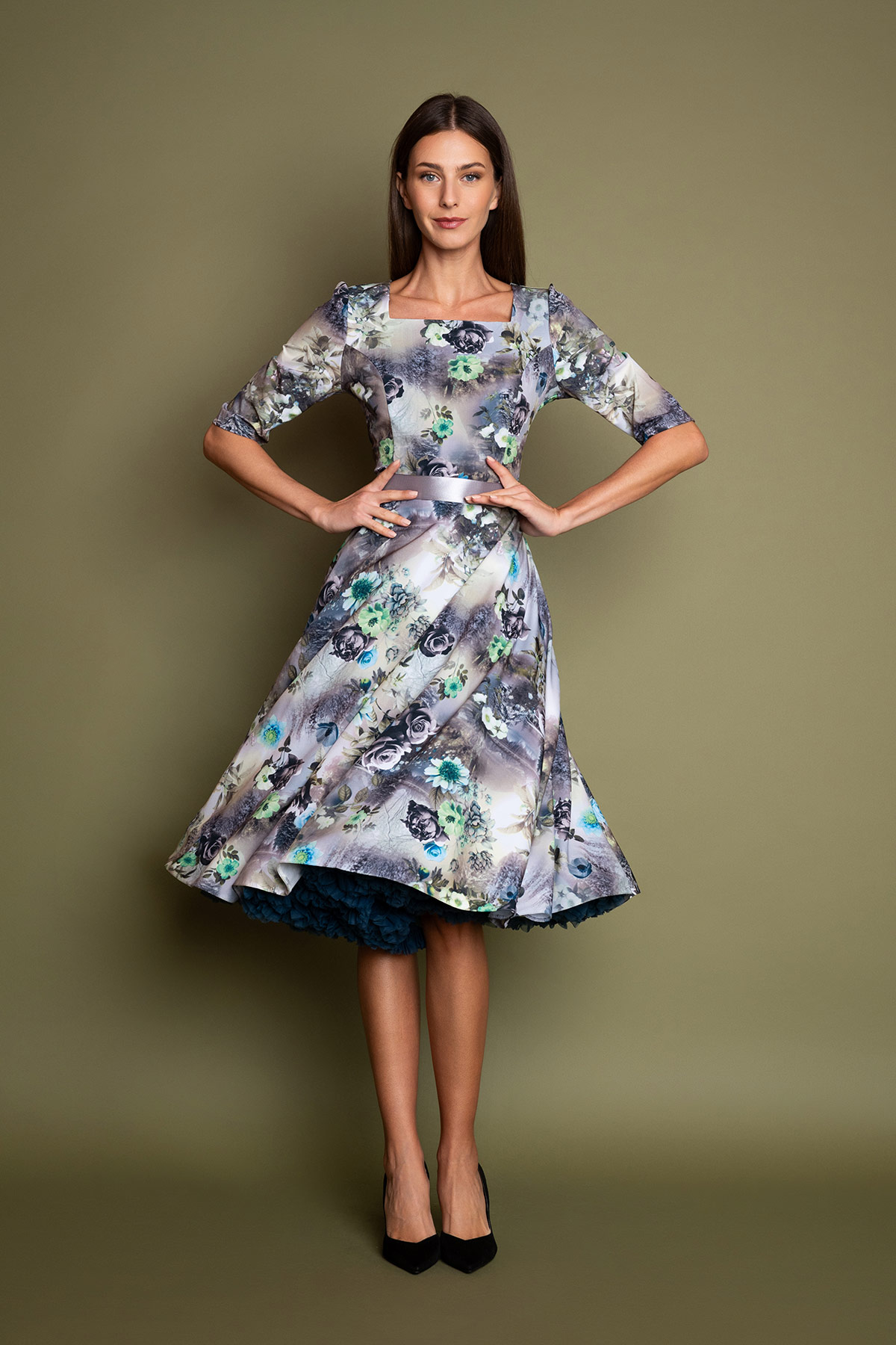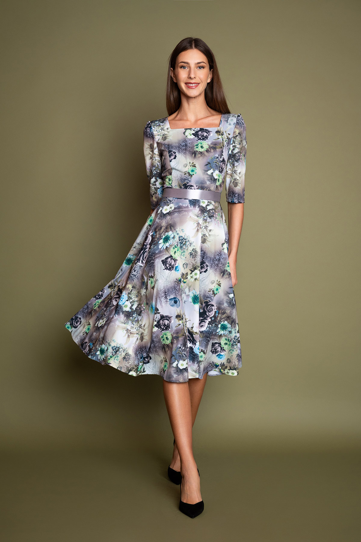 Λαδί φλοράλ φόρεμα με τετράγωνη λαιμουδιά και κοντά μανίκια, σε μεσάτη γραμμή με κλος φούστα από μαλακό και αέρινο ύφασμα, για μοναδικές εμφανίσεις.