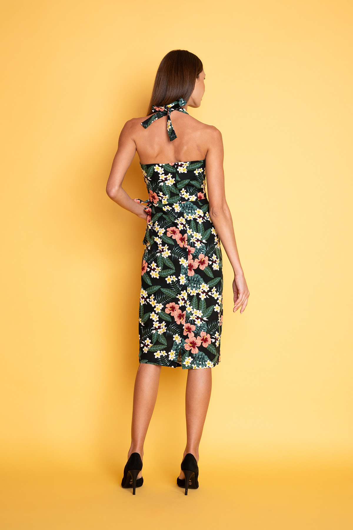 Υπέροχο σκούρο πράσινο φόρεμα με τροπικό print σε στιλ δεκαετίας του 1950, ιδανικό για ένα Tiki πάρτι κάτω από τα αστέρια! Είναι εμπνευσμένο από τα φορέματα σε χαβανέζικο στιλ των δεκαετιών του ’40 και του ’50. Είναι εφαρμοστό για να δώσει ένα pin-up vibe, αλλά είναι κατασκευασμένο από άνετο, βαμβακερό ύφασμα, ιδανικό για τις ζεστές καλοκαιρινές μέρες. Όμορφο ντεκολτέ με δύο τιράντες που δένουν στο λαιμό. Το μυστικό της φούστας βρίσκεται από κάτω: Είναι πλήρως κλειστή για να αποφευχθούν οι αμήχανες στιγμές στην πίστα! Κολακευτική λαιμουδιά μπροστά σε σχήμα καρδιάς, πλαϊνό δέσιμο, φερμουάρ πίσω.