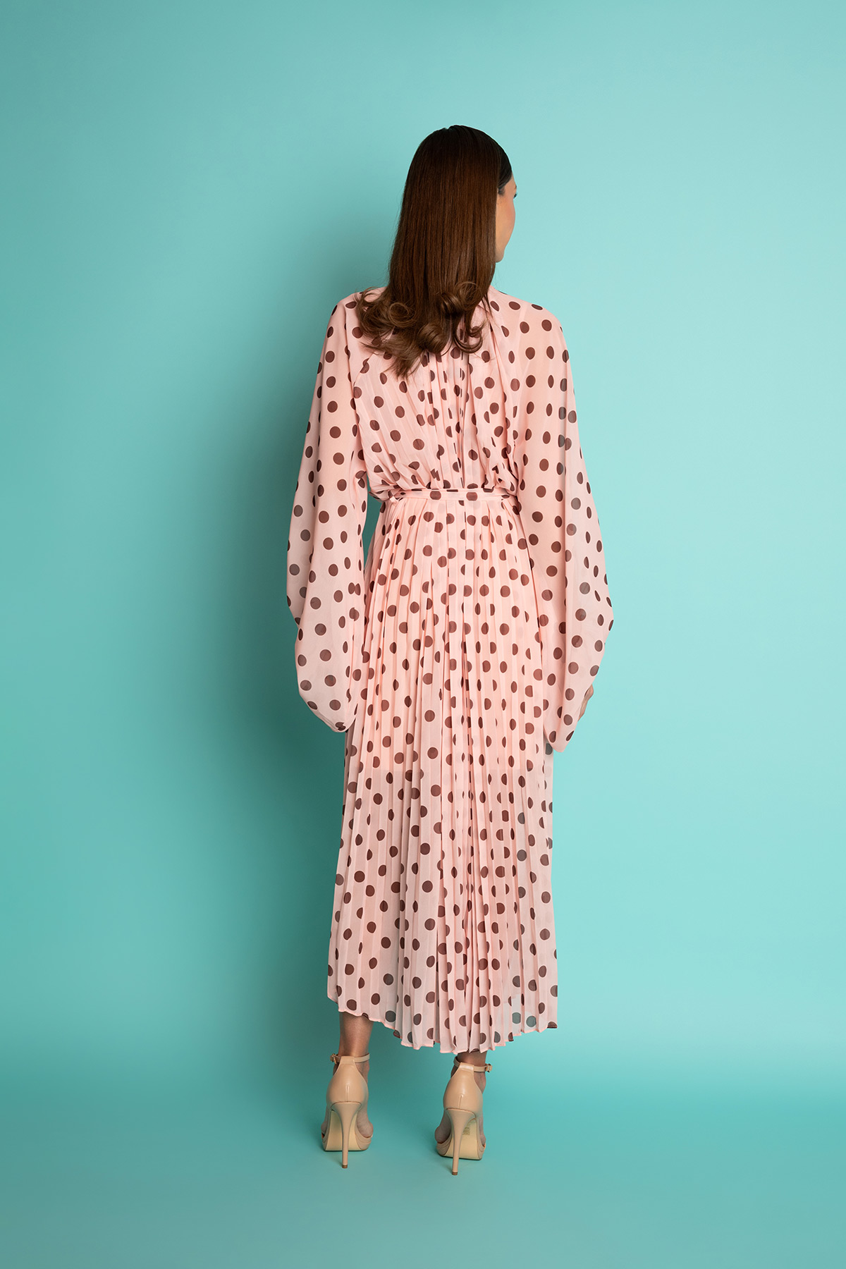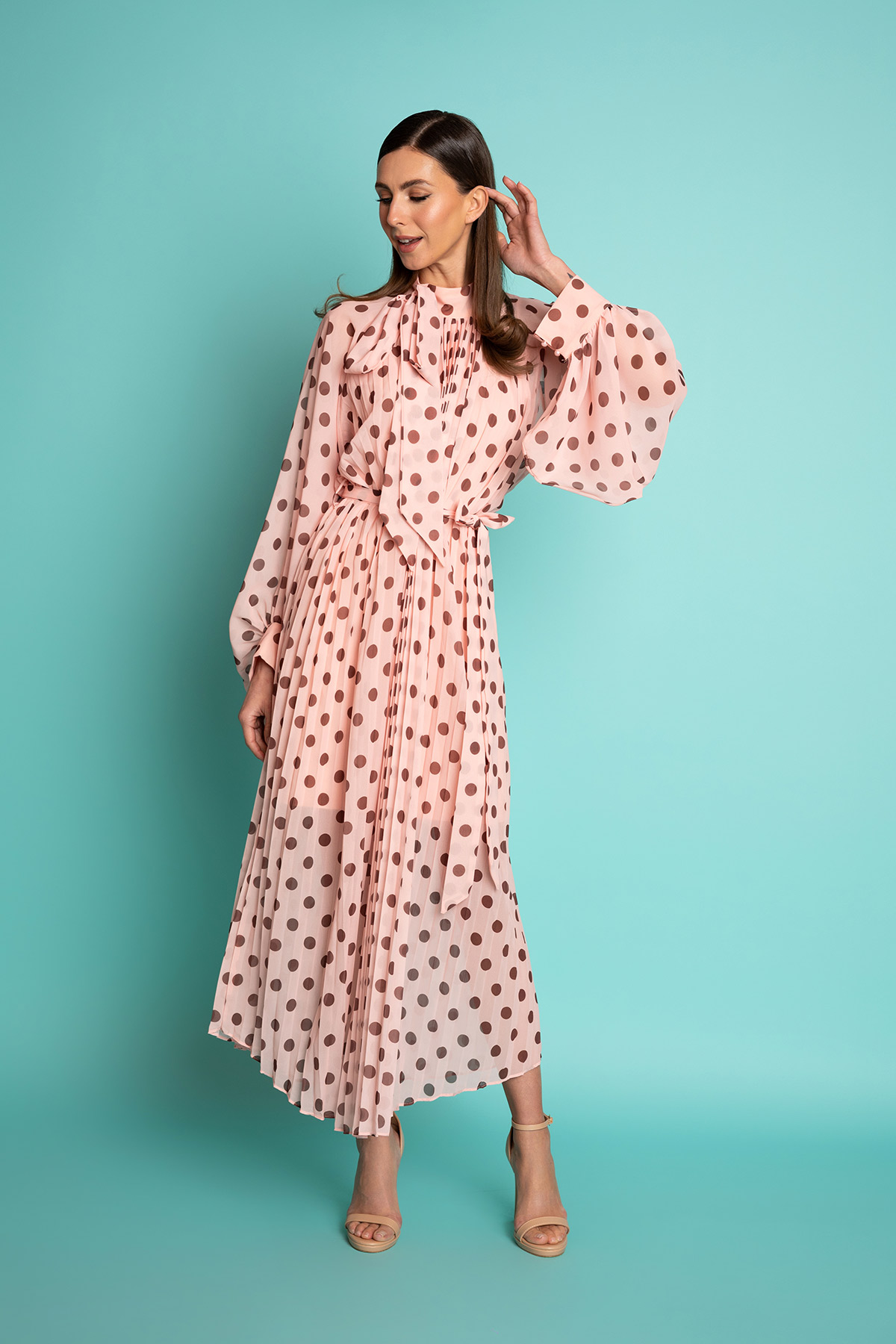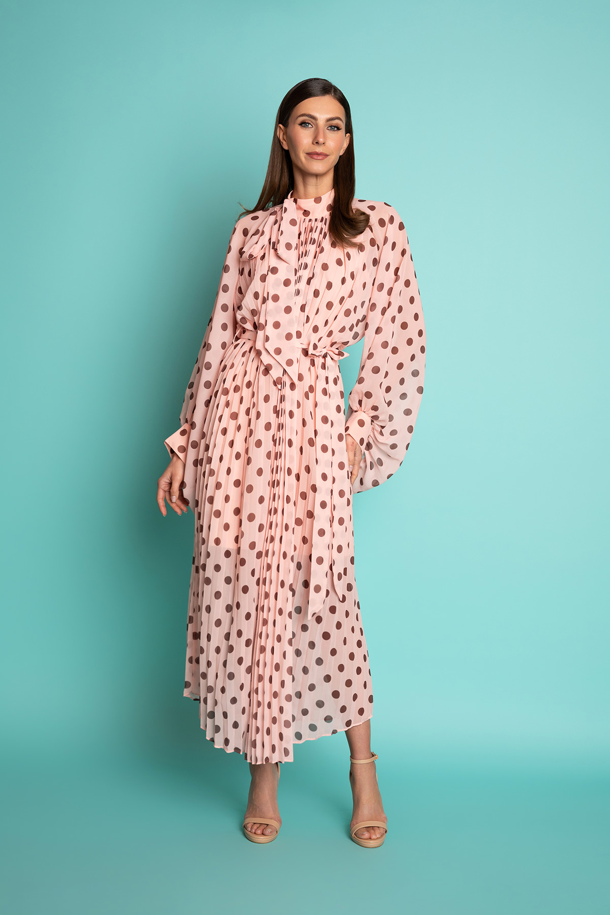 Υπέροχο ροζ φόρεμα με καφέ πουά, σε μεσάτη γραμμή, με πλισέ φούστα μέχρι τη γάμπα. Η κλειστή λαιμουδιά, με τις κουφόπιετες στον κορμό, μαζί με την κορδέλα που δένεται μπροστά δίνουν μια vintage πινελιά, ενώ τα φουντωτά μανίκια, η ζώνη στη μέση και η αέρινη midi φούστα τονίζουν τη σιλουέτα. Ρομαντικό φόρεμα για όλες τις ώρες, που μπορεί να φορεθεί καθημερινά αλλά και σε μία βάπτιση. Συνδυάστε το με ψηλές γόβες ή πέδιλα για ένα chic look.