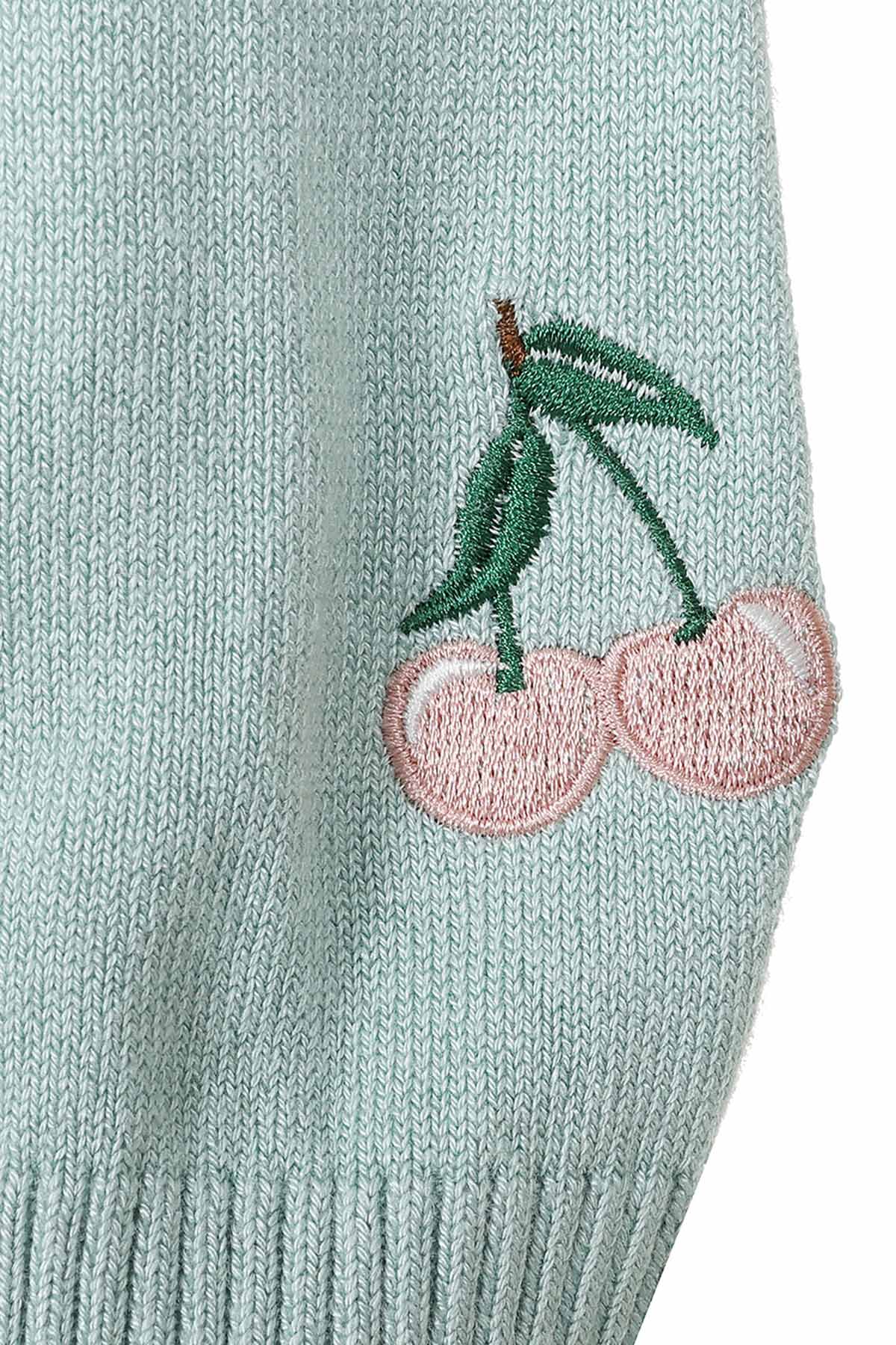 Η βεραμάν ζακέτα της συλλογής μας είναι η επιτομή της θηλυκότητας με ξεκάθαρες αναφορές στη δεκαετία του ’50. Σε μια υπέροχη μπλε-βεραμάν απόχρωση, αυτό το πλεκτό ξεχωρίζει για την κομψή cut-out λεπτομέρεια στη λαιμόκοψη, η οποία διακοσμείται από πανέμορφα κεντημένα κεράσια.