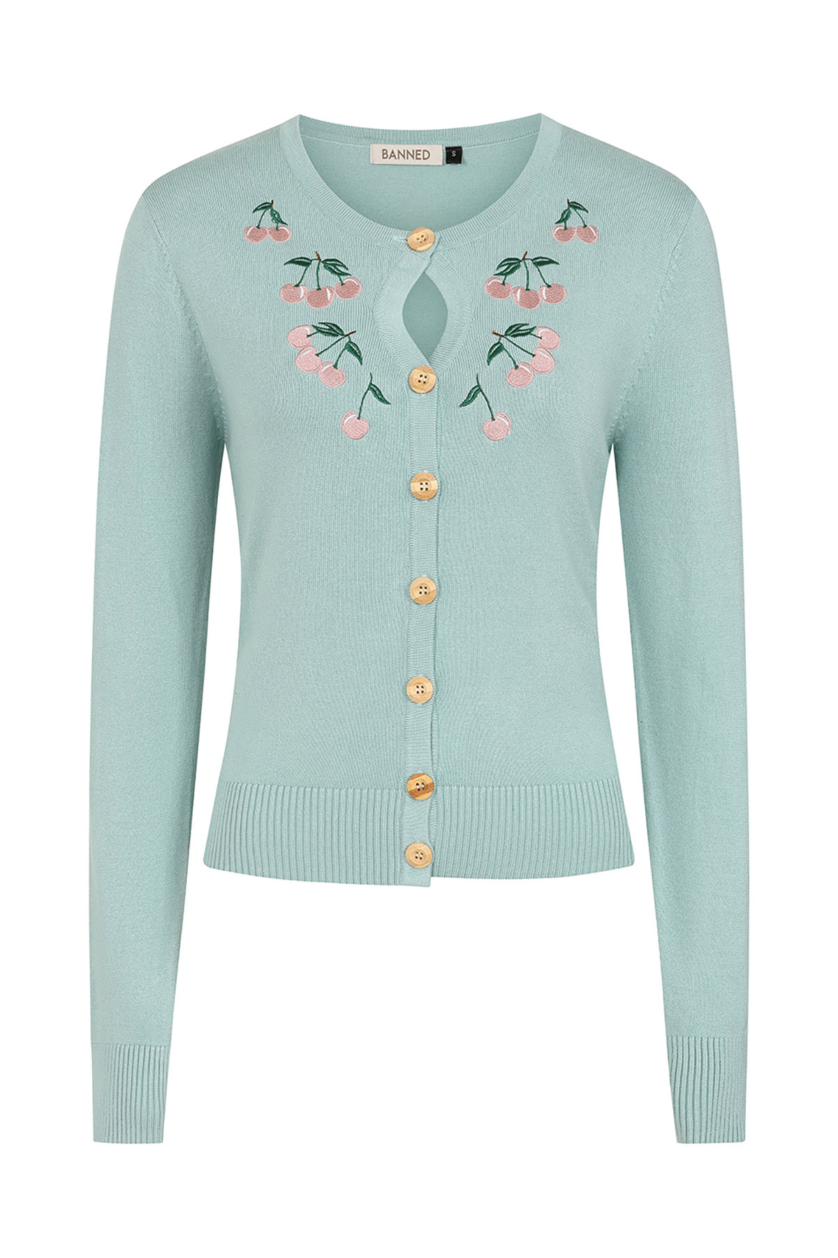 Βεραμάν ζακέτα με ξεκάθαρες αναφορές στη δεκαετία του ’50, σε υπέροχη μπλε-βεραμάν απόχρωση, με κομψή cut-out λεπτομέρεια στη λαιμόκοψη, η οποία διακοσμείται από πανέμορφα κεντημένα κεράσια. Τα vintage ξύλινα κουμπιά προσθέτουν μια αυθεντική ρετρό πινελιά, κάνοντας τη ζακέτα αυτή το ιδανικό συμπλήρωμα για τα καλοκαιρινά σας φορέματα ή τα ψηλόμεσα παντελόνια σας. Μια ντελικάτη και “δροσερή” επιλογή που θα λατρέψει κάθε λάτρης του vintage στυλ!