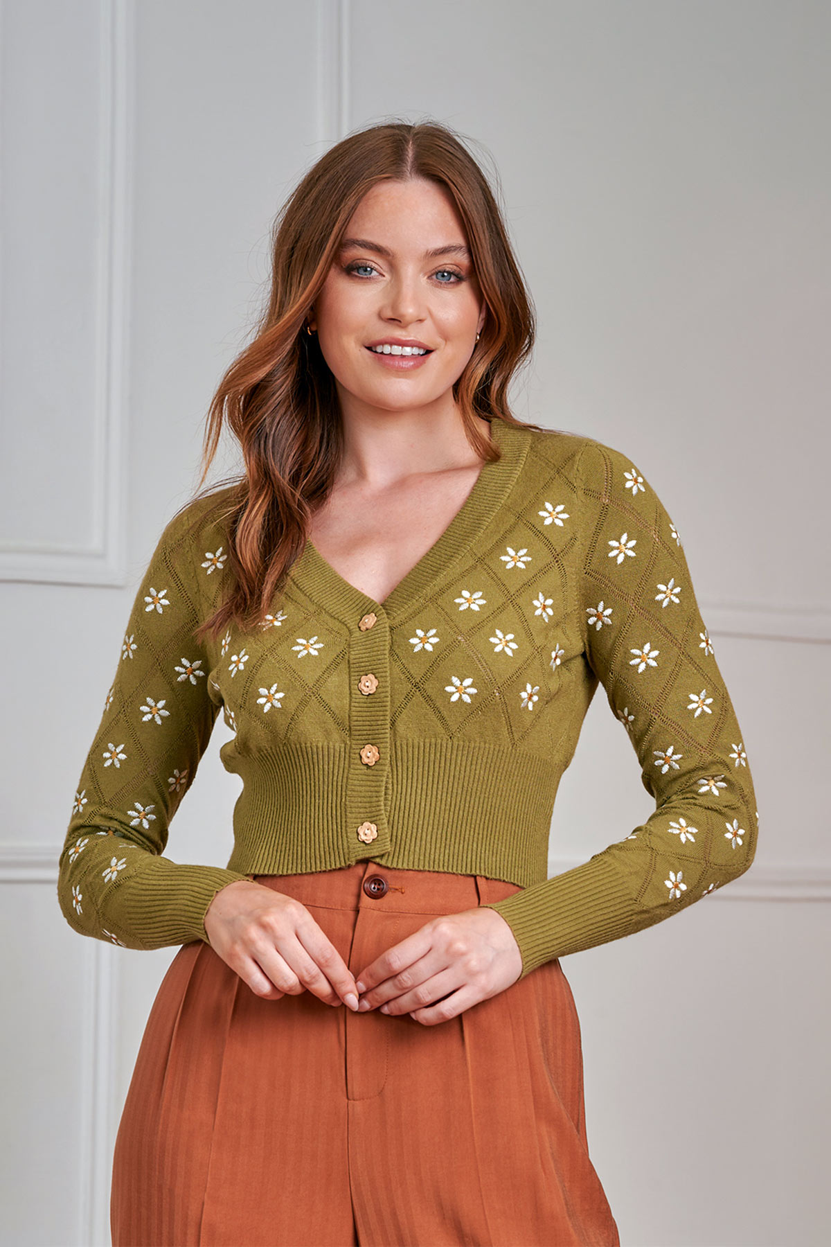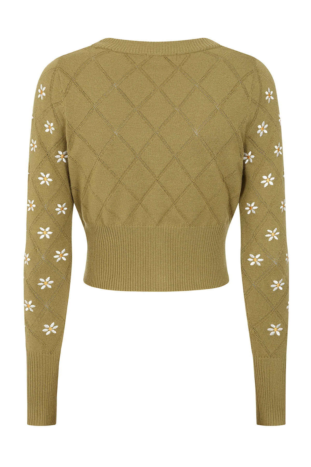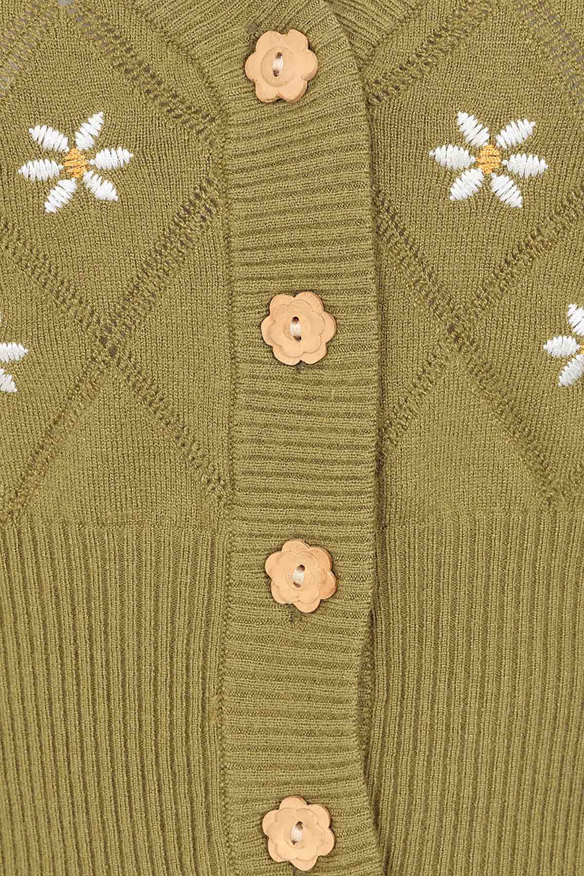 Οι ντελικάτες λεπτομέρειες είναι αυτές που κλέβουν την παράσταση: πανέμορφα floral κεντήματα, διάτρητο σχέδιο σε σχήμα ρόμβου και αυθεντικά ξύλινα κουμπιά που ολοκληρώνουν το ρετρό χαρακτήρα της. Με μακριά μανίκια και ανάλαφρη πλέξη, είναι η ιδανική επιλογή για τα δροσερά καλοκαιρινά βράδια, προσφέροντας άνεση και απαράμιλλο στυλ.